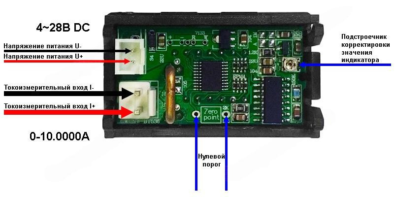 Четырёхпроводная схема подключения позволяет запитывать плату цифрового измерительного прибора как от независимого источника напряжения 4-28В DC, целиком изолированного от нагрузки, так и напрямую от напряжения измеряемого контура. Метод раздельного питания в измерительных приборах способствует достижению максимально возможной точности конечных результатов. На обратной стороне устройства распаяны малый 2-пиновый разъём питания внутренней логики устройства и крупный 2-контактный разъём токоизмерительного входа амперметра.