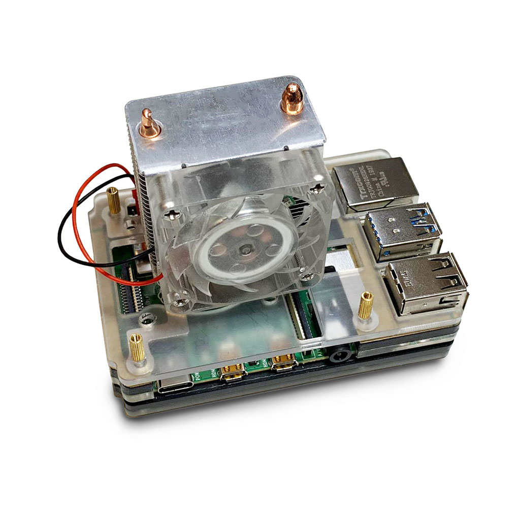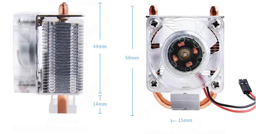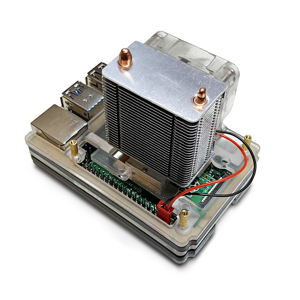 Система активного охлаждения EP-0107 состоит из двух взаимосвязнных компонентов - рассеивающего радиатора и бесшумного 7-лопастного вентилятора. Многорёберная конструкция алюминиевого радиатора башенного типа имеет большую площадь теплоотведения. Контактирующую с процессором площадку и многослойный радиатор объединяет вместе толстая медная трубка диаметром 5мм, обладающая повышенной теплопроводимостью. Естественный процесс охлаждения радиатора эффективно ускоряется за счёт направленного на него воздушного потока, генерируемого вентилятором. Кулер оснащён тремя яркими RGB-светодиодами, плавно меняющими цветовые оттенки свечения во время работы. Вся конструкция системы активного охлаждения ICE Tower Fan 52Pi RGB LED фиксируется на плате Raspberry Pi двумя алюминиевыми креплениями и функционирует от 5-вольтового напряжения, выводы которого присутствуют в коннекторе GPIO. Металлические пластины крепления EP-0107 совместимы с версией Raspberry Pi 4.