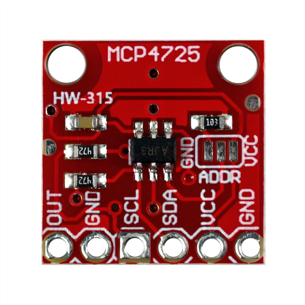 Если у вас будет более одного MCP4725 на шине, вы также захотите отключить подтягивающие резисторы на всех, кроме одного модуля. Резисторы включены по умолчанию. Если вам нужно отключить их, вам нужно будет вырезать перемычки с обратной стороны. Если вам когда-либо понадобится снова включить подтягивающие резисторы, просто припаивайте их обратно.