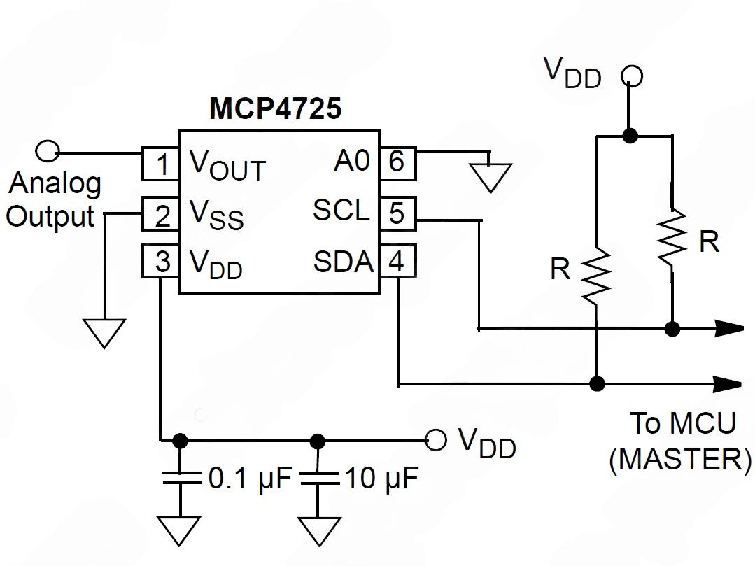 MCP4725 представляет собой одноканальный 12-разрядный, буферизованный цифро-аналоговый преобразователь со встроенным EEPROM и последовательным интерфейсом, совместимым с I2C.