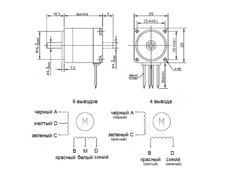 Двухфазный, биполярный, 4х проводный. Ток фазы: 0.6А. Момент удержания: 0.18 кг/см. Вылет вала: 10.3мм/8мм. Шаг: 1.8°. Размеры: 20х20х30мм. Вес 50 г.