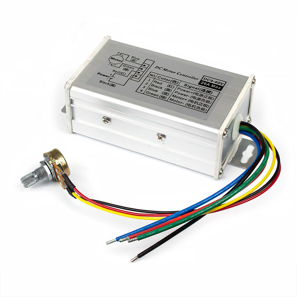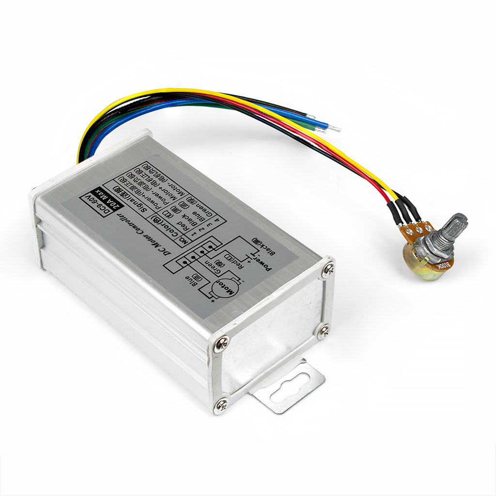 Регулятор оборотов двигателя ШИМ. Напряжение 12-48В, максимальный ток 20А, продолжительный ток 15А. Предохранитель на 20А встроен. Переключатель направления вращения сверху вниз: по часовой-стоп-против часовой. Диапазон регулировок: 0-100%, Размеры: 92*52