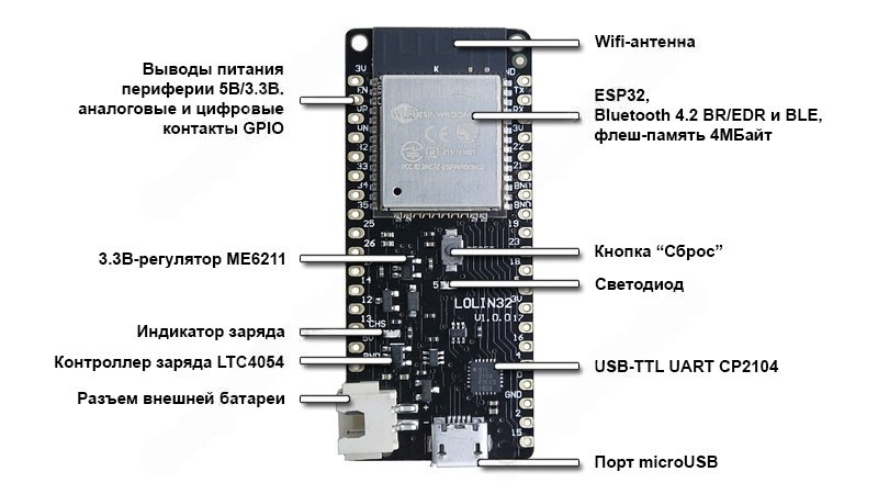 Обзор контроллера Wemos Lolin32 ESP-WROOM-32, компоновка элементов на плате