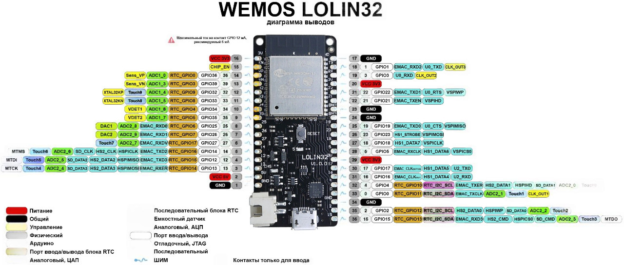 Распиновка Wemos Lolin32, цоколёвка выводов ESP-WROOM-32 ESP32