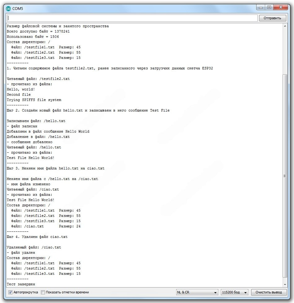 Существует одна очень важная особенность SPIFFS — она не поддерживает каталоги. Так если создаётся файл с путём "/dir/test.txt", SPIFFS фактически создаст файл с таким же именем, вместо файла с именем "test.txt" внутри папки "/ dir". Пример использования базовых функций системы SPIFFS. В архиве содержаться файлы, используемые в тексте программы примера, которые должны быть включены в образ SPIFFS.