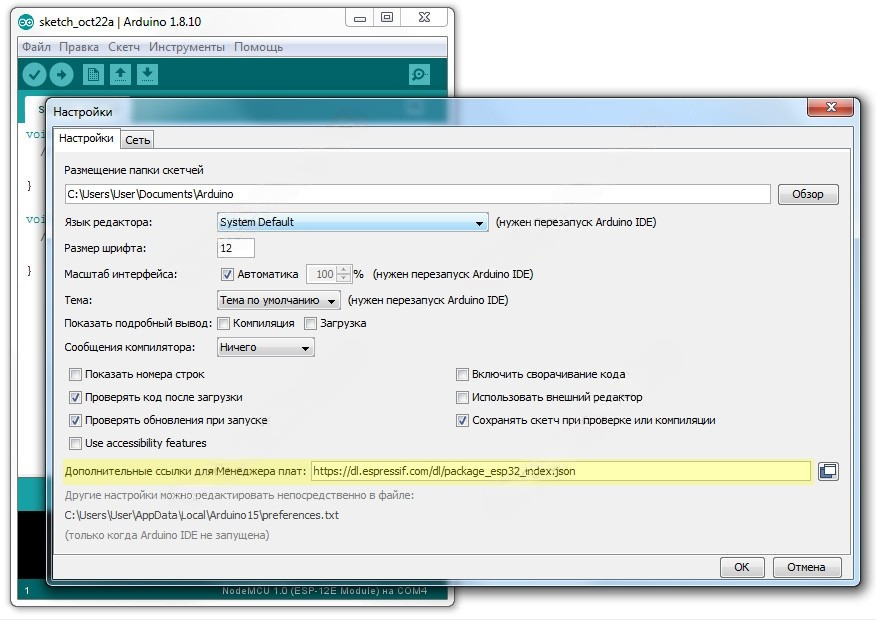 - Запустите редактор Arduino IDE, перейдите в пункт "Настройки" из меню "Файл". В строке "Дополнительные ссылки для менеджера плат" введите адрес: