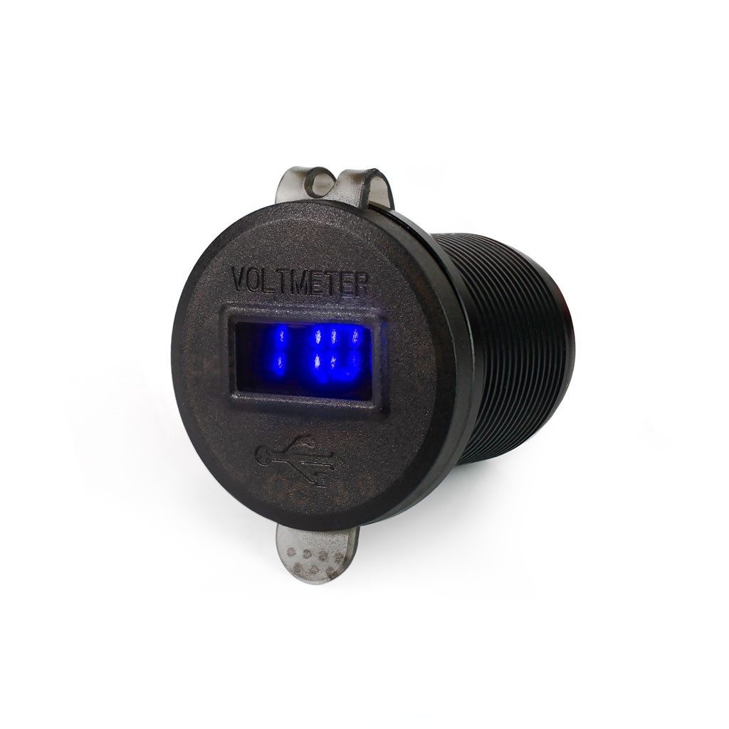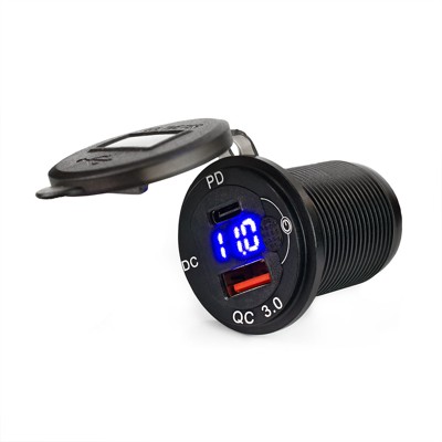 Адаптер USB 12-24V->5V 4.2A USB QC 3.0 + Type-С PD круглый с вольтметром с прозрачной крышкой с выключателем для монтажа в панель, синий