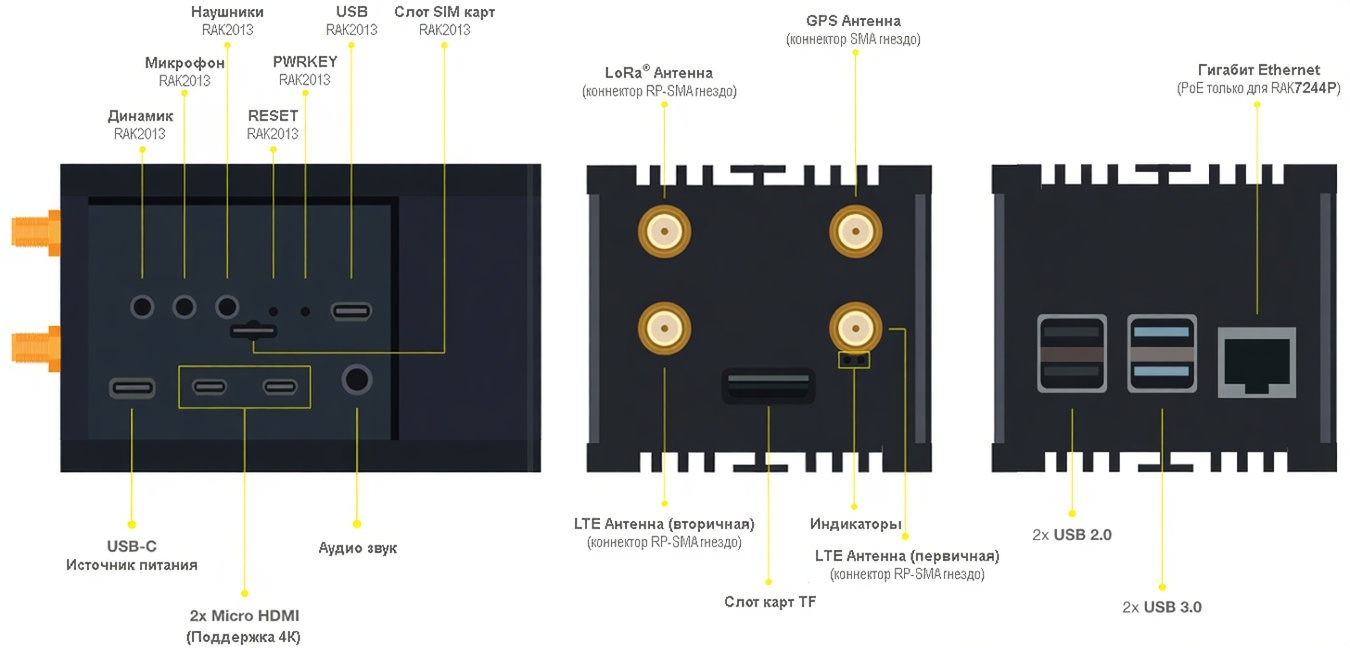 RAK7244С WisGate Developer D4 Шлюз-концентратор LoRa EU868 на платформе RaspberryPi4 2GB/Raspbian OS. Поддержка спутниковой навигании и сотовой связи LTE с функцией голосовых данных VoLTE. В расширенной комплектации с антеннами LoRa, GPS и 2хLTE. Питание