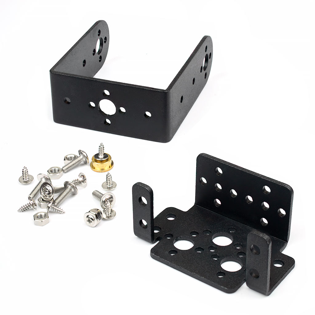 Объединённые в одну конструкцию, кронштейны Botmaker MU37B позволяют соорудить поворотную платформу для управления видеокамерой или различными датчиками. Набор кронштейнов предназначен для сборки рулевых и карнданных узлов или частей роботизированых конструкций с двумя степенями свободы (двумя центрами/осями вращения в диапазоне углов 180-360°). Набор состоит из двух алюминиевых кронштейнов, подшипника, и крепежа. Все отверстия кронштейнов для серво строго стандартизованы и хорошо сочетаются с установкой любых сервоприводов типового размера таких фирм производителей как например: Spektrum, Parallax, Hitec и SpringRC.