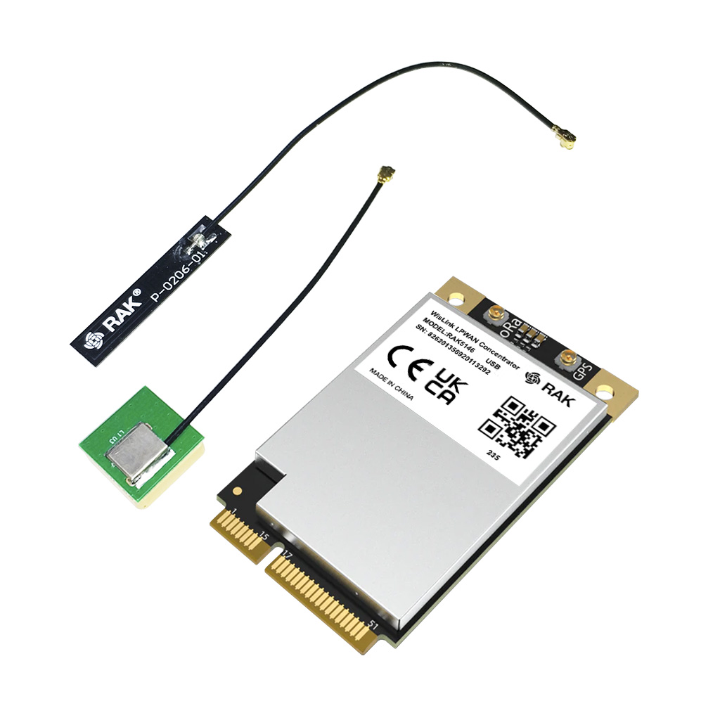 RAK5146 укомплектован одним чипом SX1303 и двумя SX1250. Первый чип работает с радиочастотным сигналом и одновременно является ядром устройства. В остальных реализованы модем LoRa и функции обработки. Встроенная дополнительная схема преобразования сигналов обеспечивает совместимость со стандартом PCI Express Mini Card. Доступны два коннектора UFL для интеграции внешних антенн.