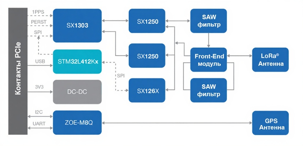 Концентратор RAK5146 основан на эталонном дизайне Semtech для чипа SX1303, показана минимальная схема применения модуля. Модуль работает от источника постоянного напряжения с характеристиками не менее 3.3В / 1А. Интерфейс SPI должен присутствовать в разъёме PCIe и быть подключен к управляющему процессору.