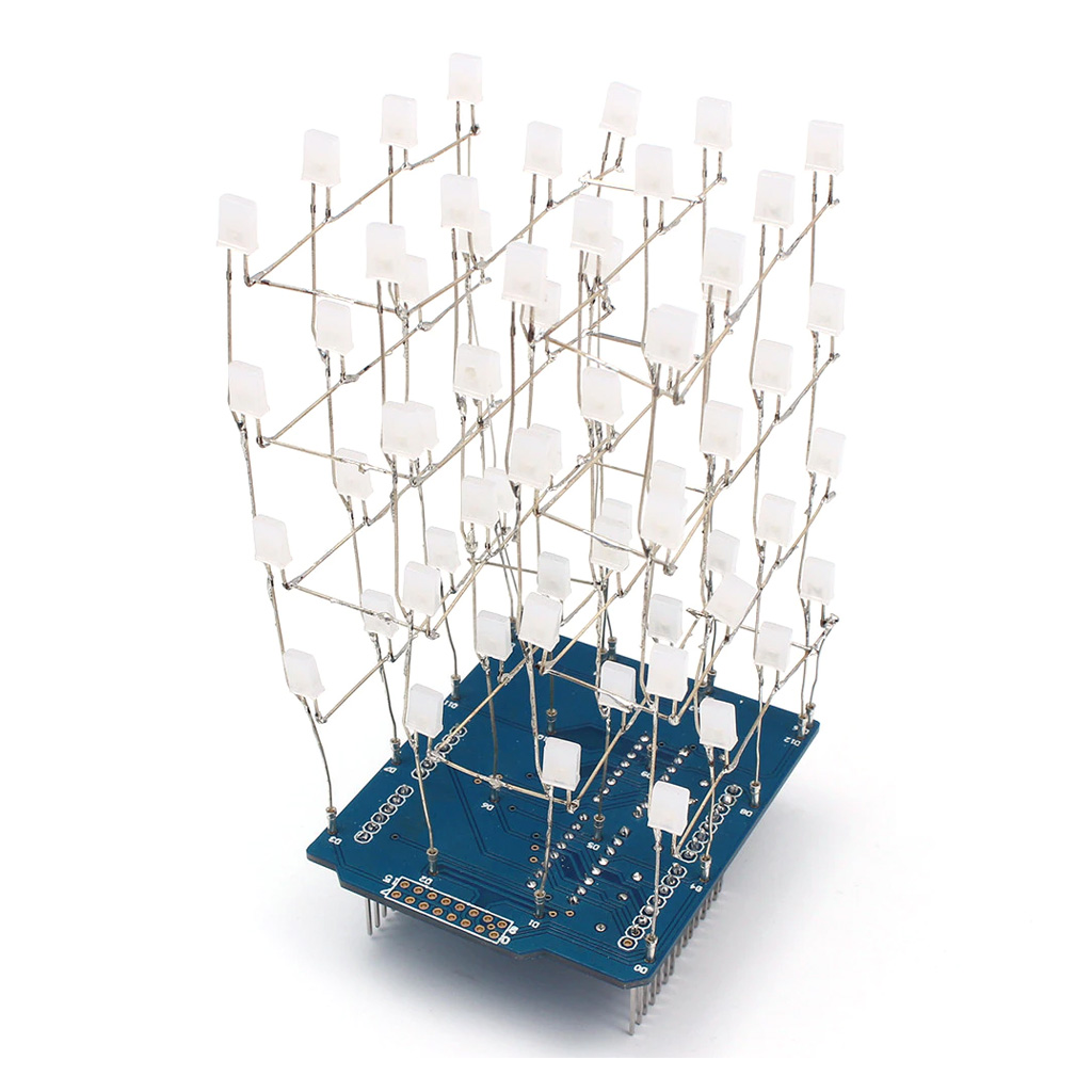 Набор для самостоятельной сборки "4x4x4 Светодиодный куб 3D" от команды ICStation Team, позволяет создавать любые мультимедийные приложения, способные демонстрировать разнообразные объёмные визуальные эффекты: вспышка, затухание, вращение, качение и др. Конструктор разработан в форм-факторе модуля расширения Arduino UNO, и не рассчитан на самостоятельное функционирование без использования совместимого управляющего контроллера (приобретается отдельно). В 5-вольтовой схеме трёхмерного светодиодного кубика, состоящего из 64 синих светодиодов плоской прямогульной формы 5мм, применяются микросхемы расширения цифровых портов на сдвиговых регистрах. Они распределяют напряжение по 20 сигнальным линиям LED-куба, задействуя для этого сокращенное до 8 количество контактов ввода-вывода программируемого контроллера.