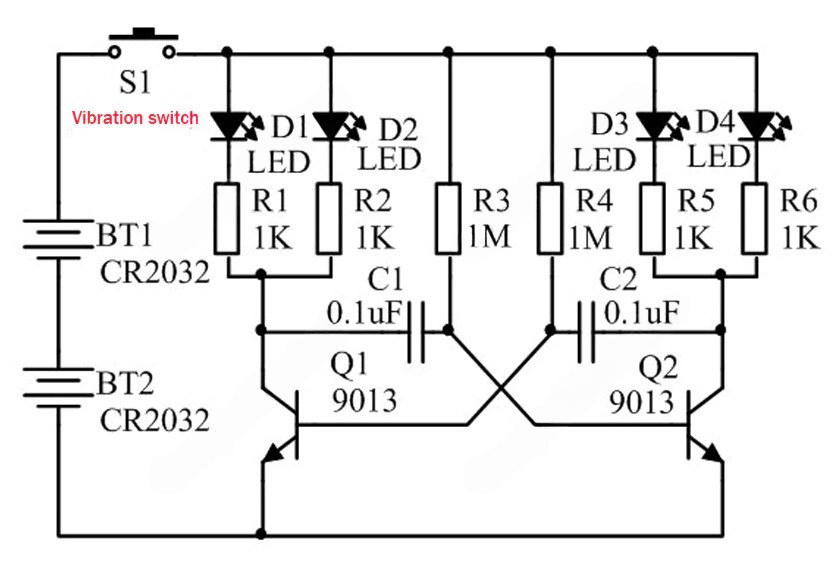 Конструктор "Светящийся волчок" функционирует от двух элементов питания CR2032. Электронная модель небольшой по размеры юлы, всего 5 х 3 см, построена на основе схемы простейшего мультивибратора, создающего прямоугольные ипульсы напряжения. Чтобы схема светодиодного волчка включилась, конструкцию следует поставить на ровную поверхность стола или на пол, затем сильно раскрутить. Центробежная сила вращения не только удерживает юлу в вертикальном положении, её достаточная величина воздействует на пружинно-вибрационный включатель S1, и замыкает расположенные врутри электрические контакты. В правом и левом плече мультивибратора расположены светодиоды, подключенные попарно и расставленные на плате в шашечном порядке D1, D3, D2, D4. Ими управляют два транзистора Q1 и Q2, бесконечно и поочерёдно переключающиеся между собой. На протяжении времени открытия каждого из транзисторов, связанные с ним светодиоды продолжают ярко светиться, оставляя "след" в темноте. За счёт быстрого попеременного включения светодиодов D1, D3 и D2, D4 появляется красивый эффект пунктирных световых линий.