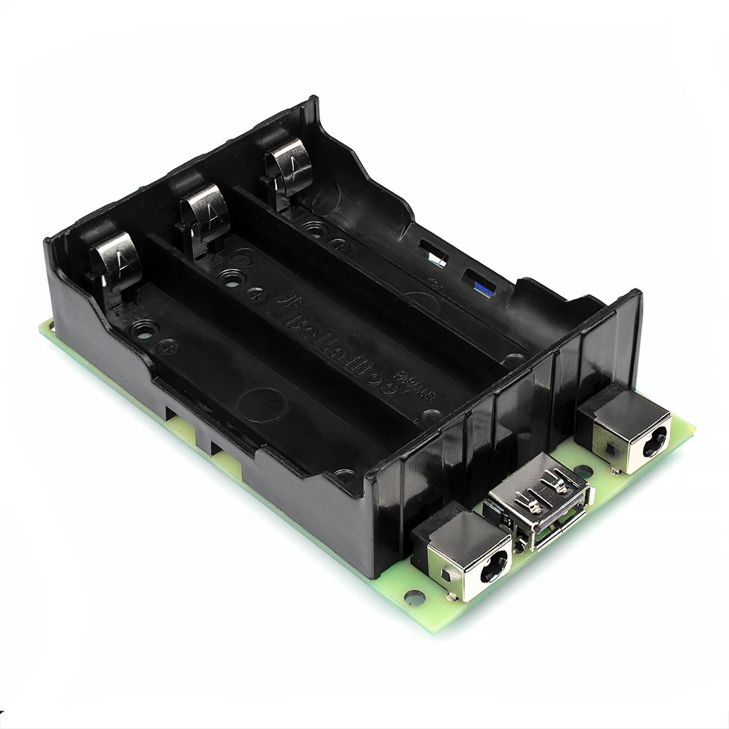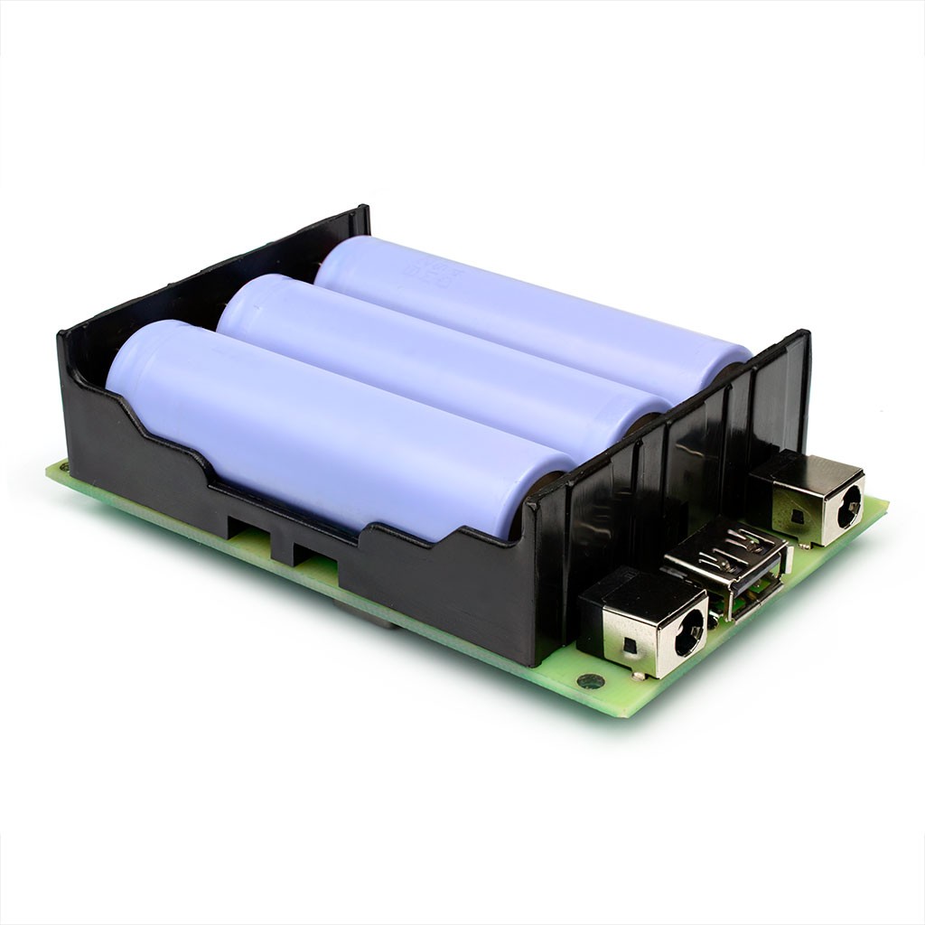 Модуль снабжен контроллером литий-ионных аккумуляторов 3S с выходным током до 10А, индикатором остаточного заряда и понижающим DC-DC преобразователем на 3,3/5/9V 5А (опционально), а так же дополнительно можно установить еще один DC-DC преобразователь для питания по USB. Суммарно на выходе можно получить - 12В 10А, 3,3/5/9В 5А, USB 5В 5А.