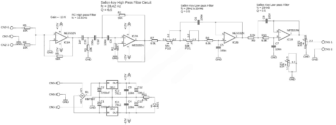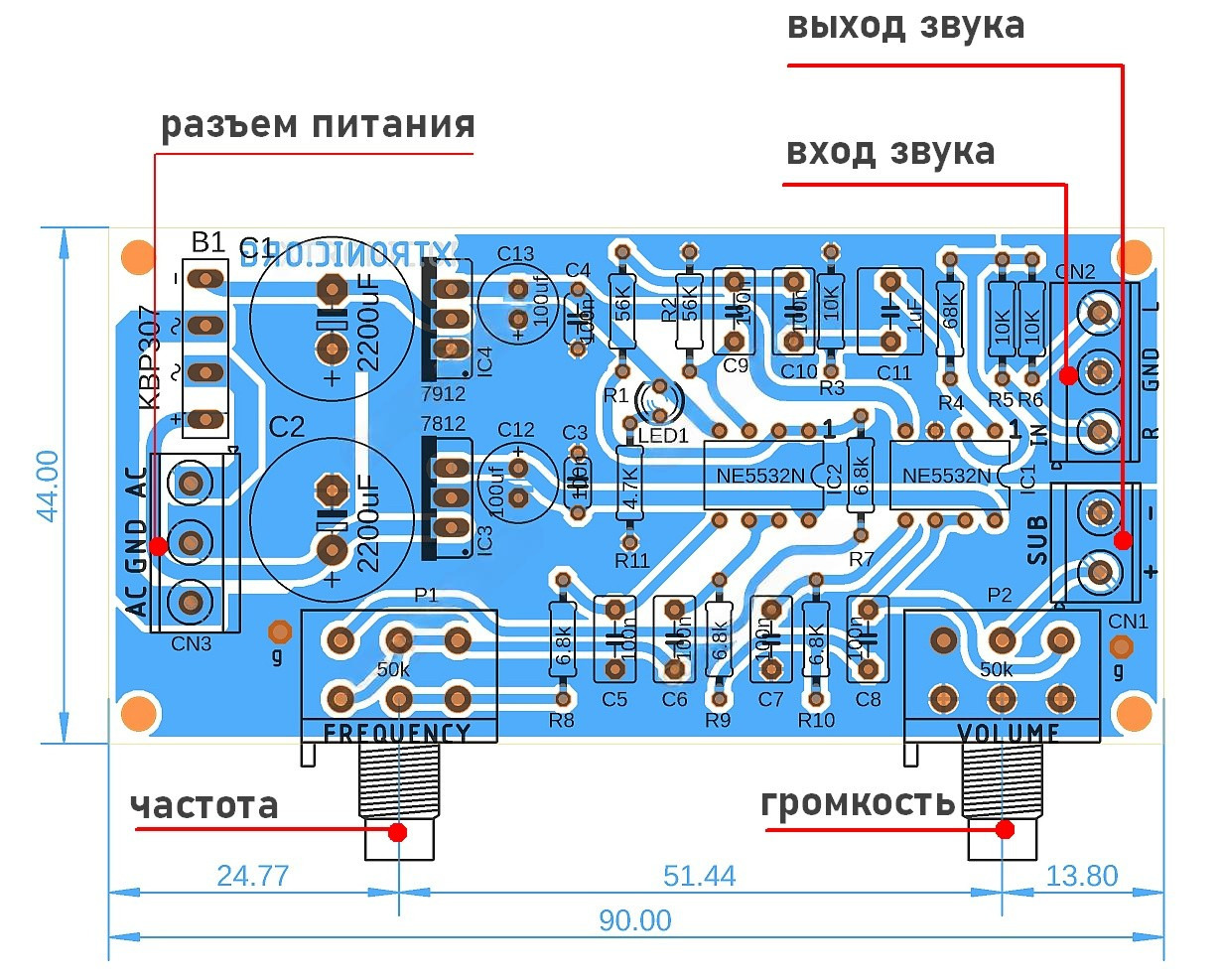 Активный фильтр низких частот на NE5532 для сабвуфера, питание 12VAC двуполярное