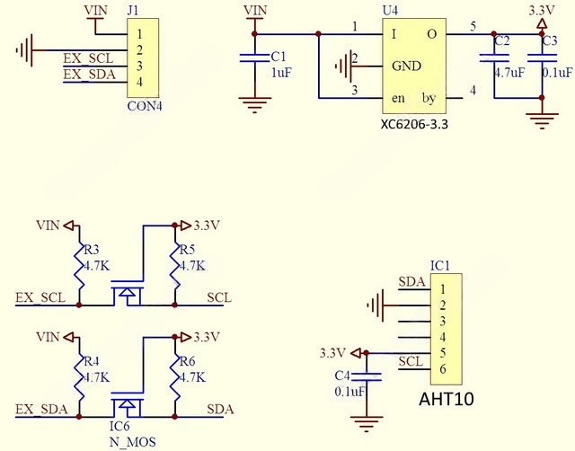 Датчик температуры и влажности AHT10 совмещает в себе точность и малый размер. Датчик AHT10 проходит точную заводскую калибровку. Измерение влажности происходит благодаря современному MEMS модулю. LDO стабилизатор XC6206-3.3, установленный на плате, позволяет питать датчик напряжением от 3,3 до 7 вольт. Для взаимодействия с микроконтроллерами использует I2C протокол. Также на плате установлен конвертер логических уровней (см. принципиальную схему), что позволяет использовать микроконтроллер с логическими уровнями 3,3 или 5 вольт. Длительное воздействие на сенсор в течение 60 часов при влажности > 80% может привести к временному дрейфу относительной влажности на + 3%. Датчик медленно вернется к паспортной точности ± 2 при нормальных условиях эксплуатации.