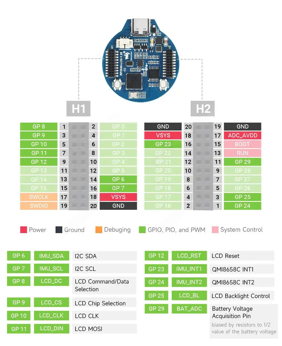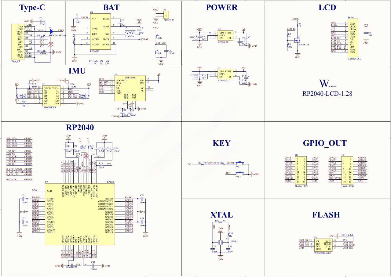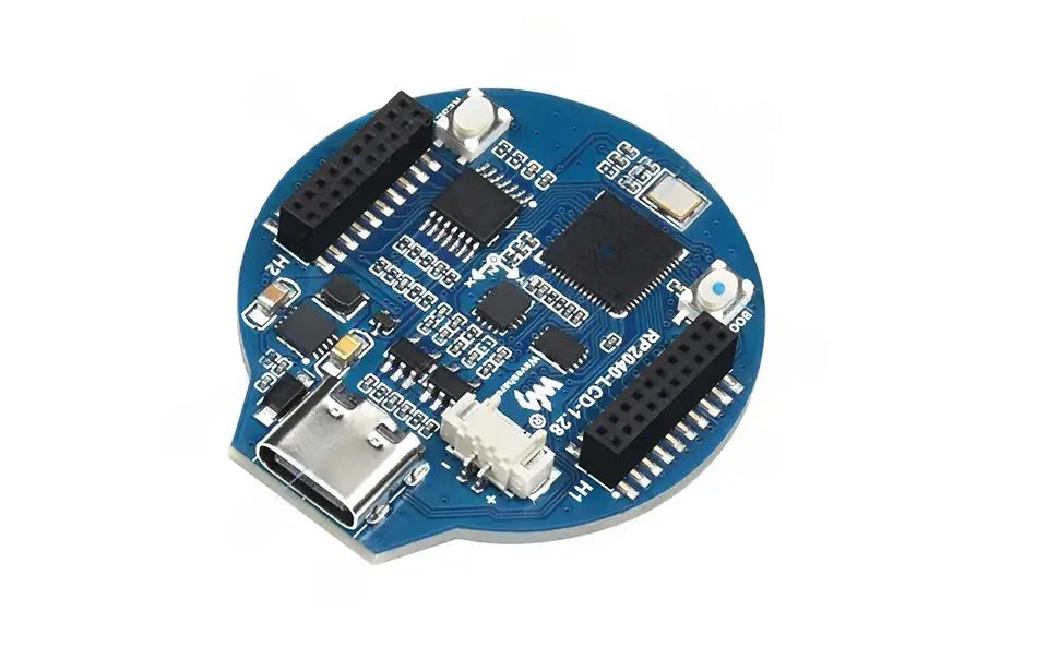 Waveshare RP2040 LCD - компактный аналог Raspberry Pi Pico от Waveshare, с круглым 1,28" IPS-дисплеем и 6-осевым датчиком положения разработанный для создания носимых устройств в виде часов.
