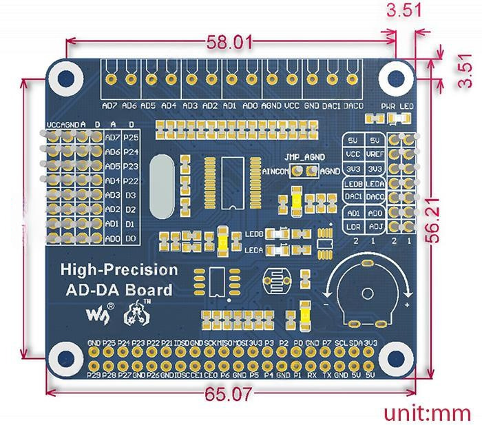 На плате расширения AD/DA размещены 24-битный АЦП ADS1256 c 8-канальным несимметричным входом (4-канальным дифференциальным входом) и 16-битный ЦАП DAC8552 с 2-каналым выходом. Кроме двух микросхем преобразователей, в модуль интегрированы вспомогательные аналоговые компоненты — это простые фоторезистор, поворотно-механический потенциометр 10кОм и пара светодиодов красного цвета. С помощью набора быстросъёмных перемычек-джамперов, встроенные в модуль расширения AD/DA Waveshare аналоговые компоненты легко подключаются к соответствующим входам АЦП/выходам ЦАП, и также легко отключаются. Эти независимые компоненты позволяют провести оценку преобразования аналоговых сигналов без подключения к внешнему оборудованию. А также могут быть свободно задействованы в любом приложении.
