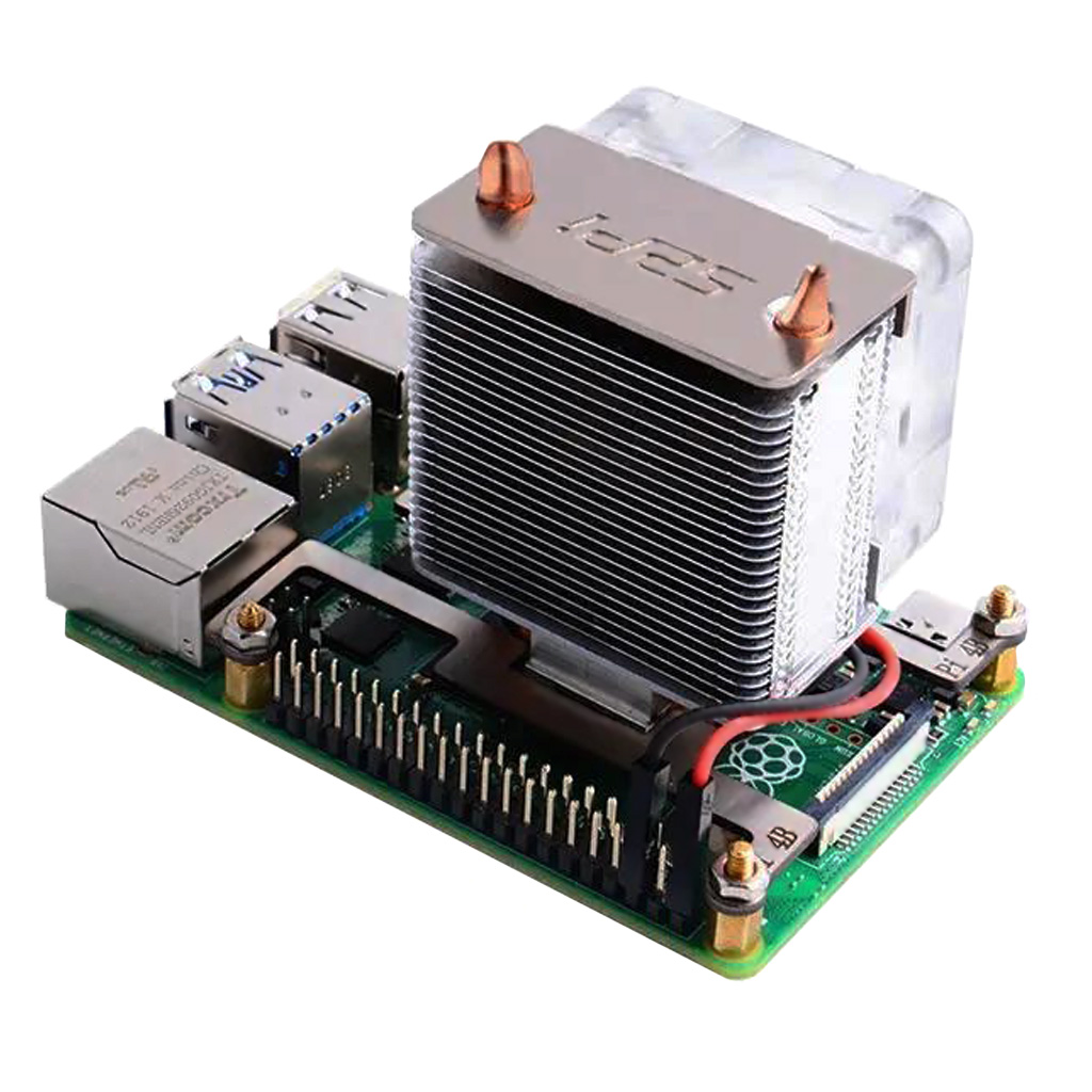 Система активного охлаждения EP-0107 состоит из двух взаимосвязнных компонентов - рассеивающего радиатора и бесшумного 7-лопастного вентилятора. Многорёберная конструкция алюминиевого радиатора башенного типа имеет большую площадь теплоотведения. Контактирующую с процессором площадку и многослойный радиатор объединяет вместе толстая медная трубка диаметром 5мм, обладающая повышенной теплопроводимостью. Естественный процесс охлаждения радиатора эффективно ускоряется за счёт направленного на него воздушного потока, генерируемого вентилятором. Кулер оснащён тремя яркими RGB-светодиодами, плавно меняющими цветовые оттенки свечения во время работы. Вся конструкция системы активного охлаждения ICE Tower Fan 52Pi RGB LED фиксируется на плате Raspberry Pi двумя алюминиевыми креплениями и функционирует от 5-вольтового напряжения, выводы которого присутствуют в коннекторе GPIO. Металлические пластины крепления EP-0107 совместимы с версией Raspberry Pi 4 / 3B+.