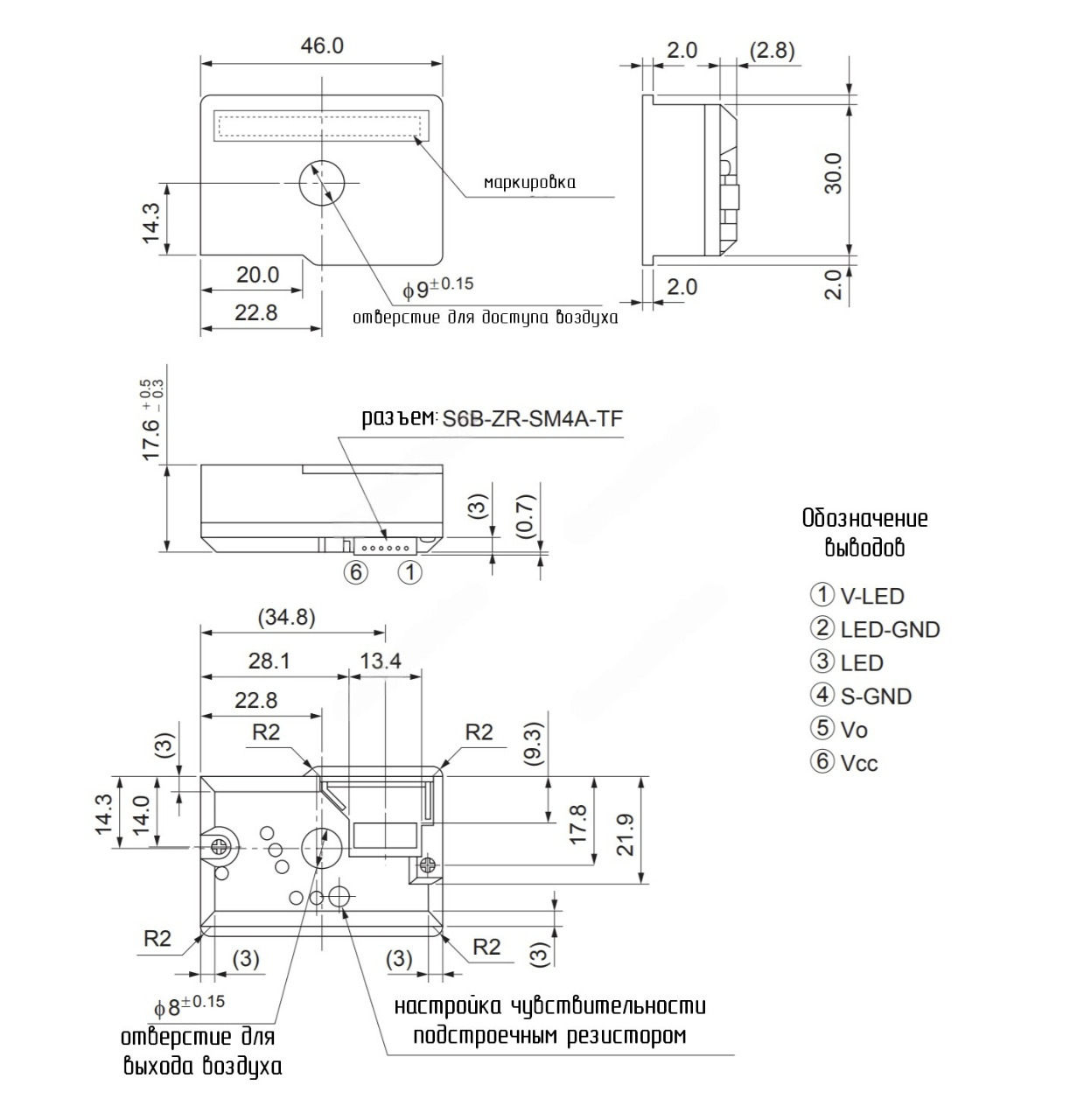 Размеры сенсора и расположение выводов.