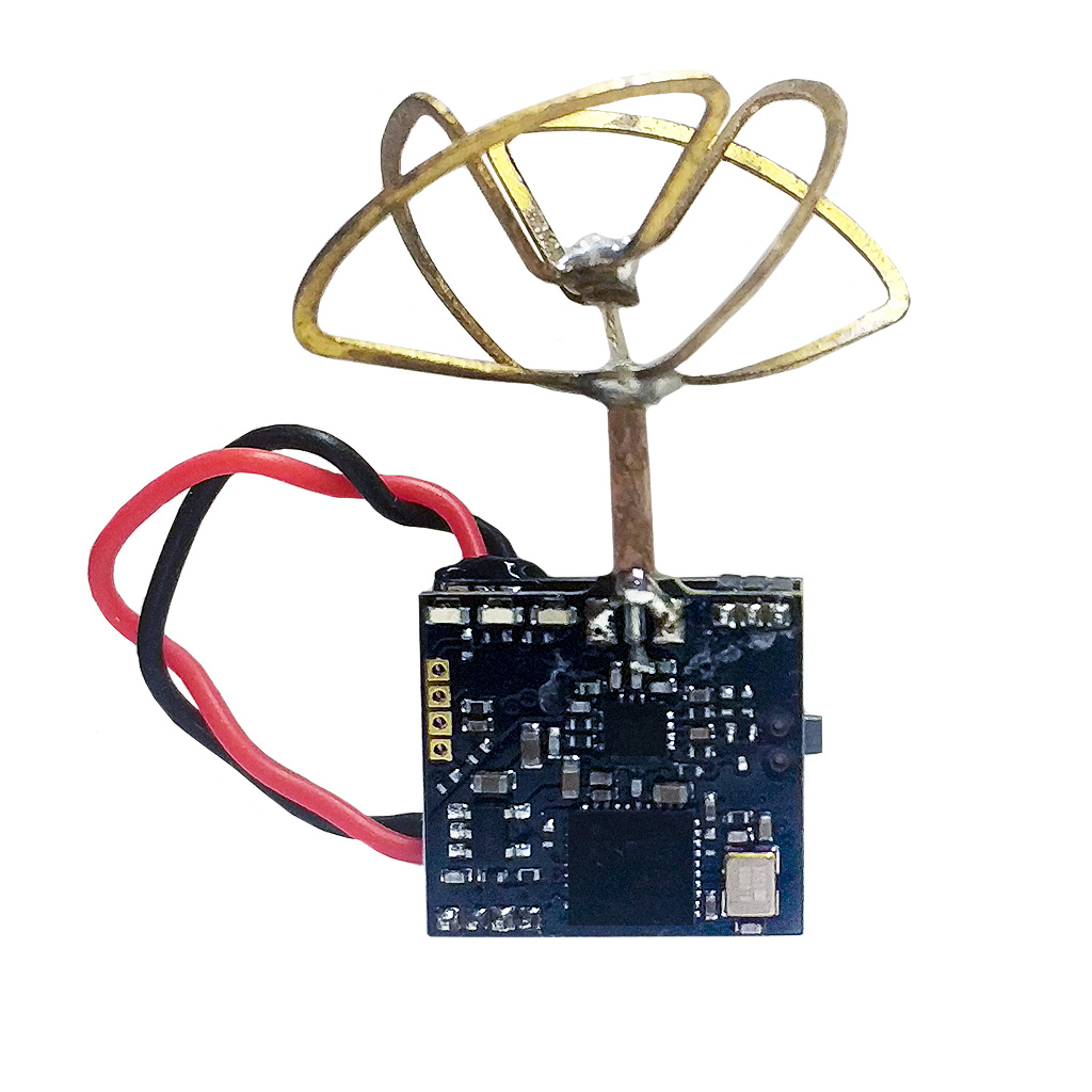Красный индикатор на обратной сторене платы указывает на настроки видеопередатчика. Всего предусмотрено 3 настройки — выбор канала 1-8, выбор частотной полосы A-B-C-D-E-F, выбор мощности 25мВт-100мВт-200мВт. Номер настройки определяется визуально, по количеству быстрых последовательных сигналов красого индикатора видеопередатчика в режиме информирования/регулировки. Синий индикатор на оборотной стороне модуля FPV-камеры такими же быстрыми последовательностями сигналов идентифицирует значение параметра для любой из 3-х перечисленных настроек.
