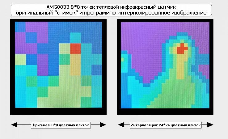 Качество оригинального "снимка" с датчика AMG8833 может быть значительно улучшено путём увеличения разрешения с применением методов математической интерполяции, реализованных в библиотеке Adafruit AMG88xx Library