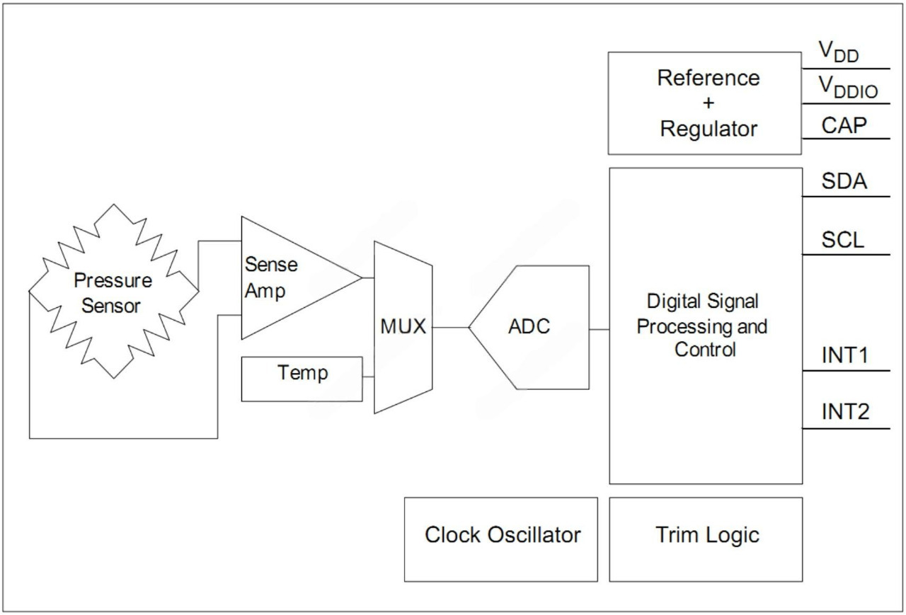 Датчик атмосферного давления воздуха MPL3115A2 позволяет измерить атмосферное давление воздуха, вычисляет высоту над уровнем моря по показаниям давления, а также измеряет температуру воздуха.
