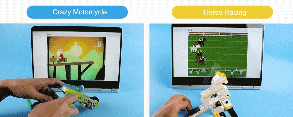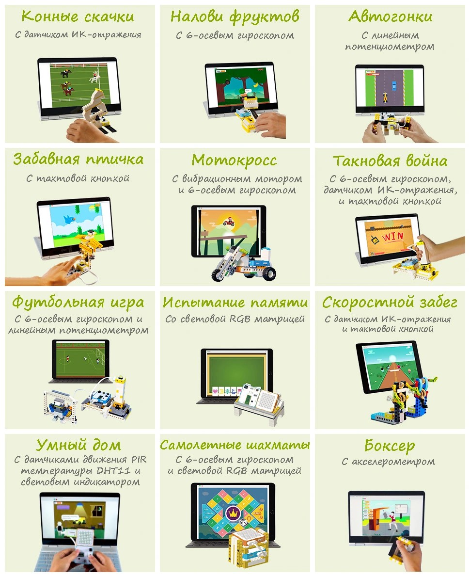 Пользователям старше 10 лет набор "Создатель" открывает секреты создания дополненной реальности на 12 простых примерах взаимодействия электроники с компьютерными играми. Электромеханические модели, собранные из 200+ частей конструктора, в наглядной форме демонстрируют участие реальных физических процессов в запрограммированном виртуальном цифровом приложении, с использованием технологий беспроводной радиопередачи Bluetooth. "Создатель" затрагивает темы определения перемещения и ориентации в пространстве трёхмерных объектов с помощью 6-осевого гироскопа/акселерометра, линейного потенциометра, источника/приёмника световых лучей в ИК-спектре и тактовой кнопки. Сборочная модель для каждого из примеров представляет интерактивный элемент управления в соответствующей игровой сцене. Доберитесь до финиша первыми в конных скачках. Наловите фруктов с друзьями и не попадитесь под бомбу. Сядьте за руль настоящего гоночного болида и успешно доведите его до финиша. Помогите птицам пролететь сквозь различные препятствия, возникающие на их пути во время полёта. Поучаствуйте в мотокроссе и пройдите на мощном мото-байке непростой маршрут. Сразитесь в танковой войне и победите, управляя своей боевой машиной. Забейте штрафной гол команде соперников в футбольной игре. Отточите свои способности в испытаниях на внимание и память. Одолейте в скорости своего оппонента в 100-метровом забеге. Узнавайте о приходе гостей или о температуре/влажности от ИИ вашего "умного" дома. Подбрасывая кубик, быстрее друзей соберите свои самолёты в центре поля в игре "Самолётные шахматы". Научитесь с "Боксёром" правильному нанесению ударов.
