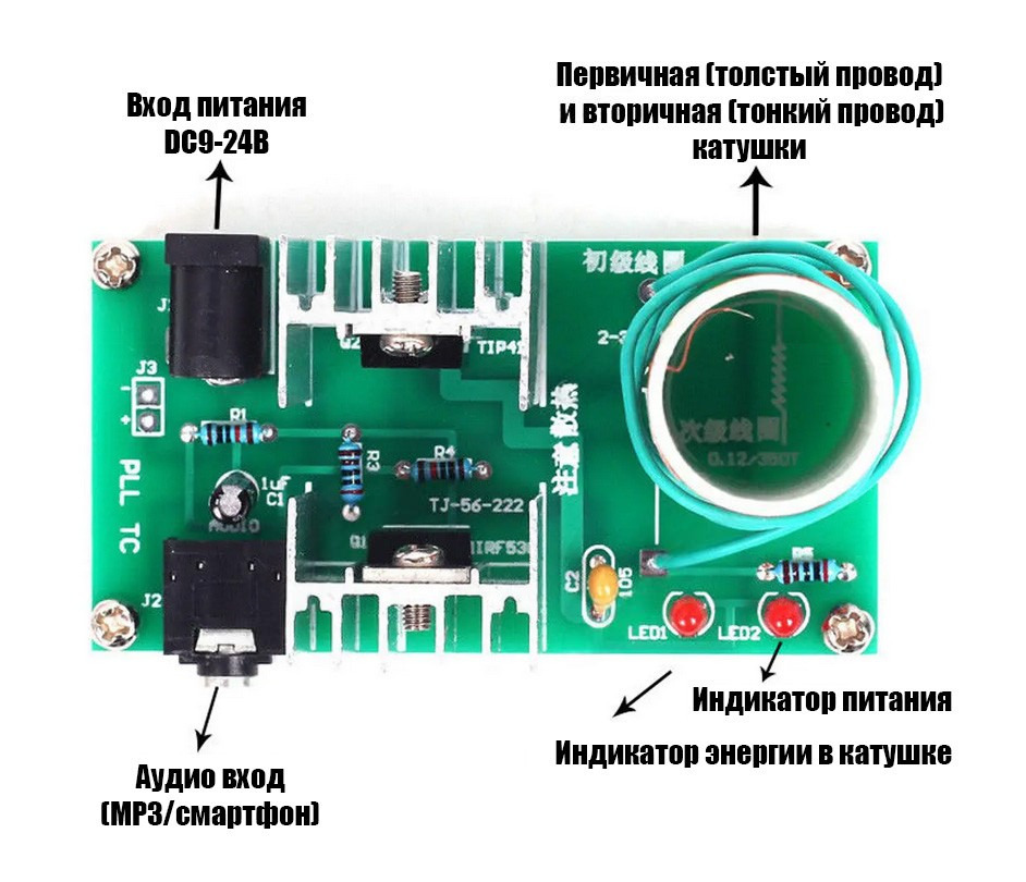 Модель ВЧ-генератора позиционируется как резонансный генератор с автоматической подстройкой частоты (АПЧ). Резонанс поддерживается обменом реактивной энергией между емкостными и индуктивными элементами (конденсаторами и катушками обеих индуктивностей) через электрическое поле. Представленная версия генератора отличается от оригинальной схемы катушки Тесла отсутствием контуров двойного резонанса и наличием полупроводникового прерывателя-разрядника в цепи первичной обмотки индуктора, аналогично качеру Бровина. Частотно-задающий генератор в паре с силовым MOSFET-ключом (вариант SSTC) может воздействовать на внешний вид и звучание разряда. Предусмотренный на плате вход для аудиомодуляции предусматривает подключение к источнику музыкальной частоты (смартфоны, MP3-проигрыватели, ПК, и др), сигнал с которого заставляет вырабатывать слабый звук из самого разряда. Светодиодные индикаторы на плате указывают уровень заряда в катушке ВЧ-генератора (LED1) и состояние напряжения питания (LED2). Конструктор работает от напряжения 9-30В постоянного тока и потребляет около 2А. Чем выше знаменатель напряжения, тем длиннее дуга выходного разряда катушки и громче звучание музыкального сигнала (выше 15В потребуется дополнительное охлаждение элементов устройства генератора).