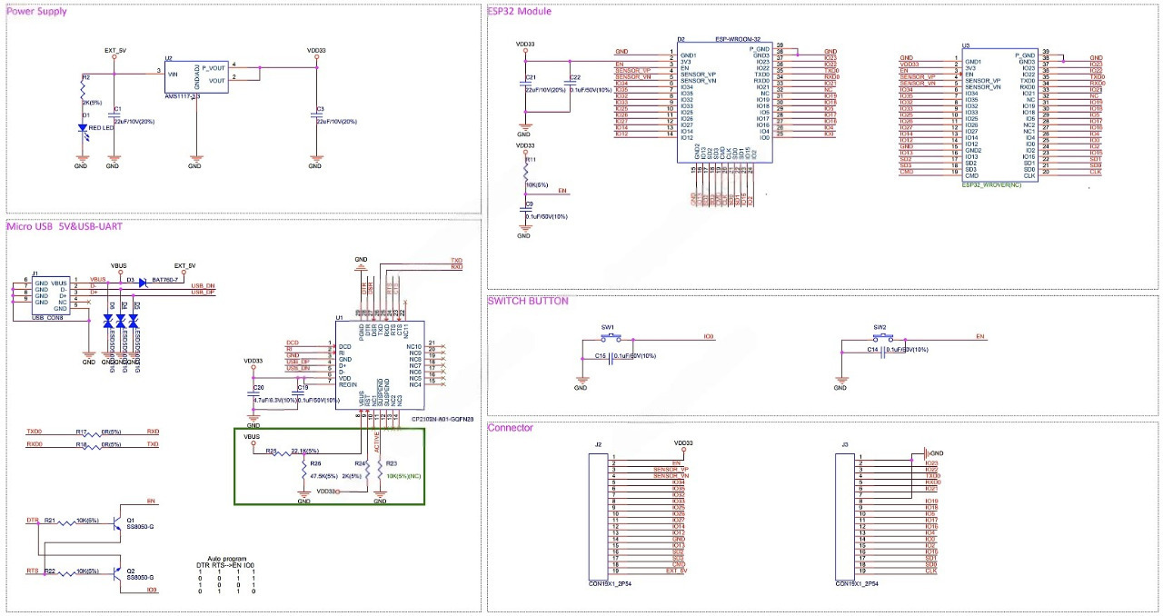Плата разработчика снабжена всем необходимым - стабилизатором напряжения на 3,3 вольт, USB-UART преобразователем CP2102, и USB разъемом для прошивки и питания платы.