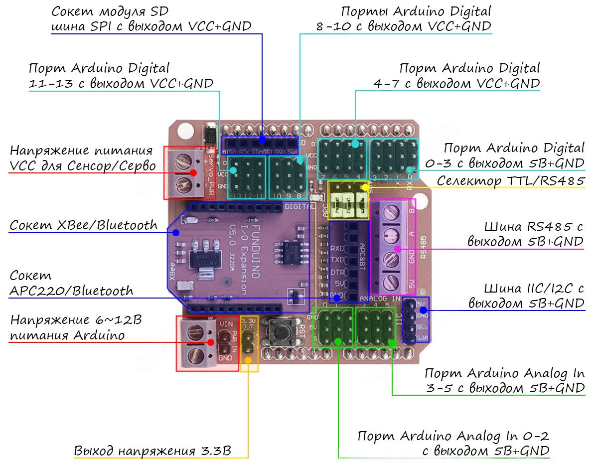 Пятая версия расширения ввода-вывода для Arduino несёт в себе множество полезных функций. Плата Funduino IO Expansion Board имеет гораздо большее количество выводов и разъёмов в отличии от стандартного набора портов, представленных в той же микроконтроллерной плате Arduino UNO R3. Расширение поддерживает интерфейсы подключения модулей беспроводной связи XBee и Bluetooth. Есть интерфейс подключения простого РЧ-трансивера APC220 с частотой рабочего радиоканала 418~450МГц. Абсолютно все доступные цифровые и аналоговые выводы Arduino скомбинированы с 5-вольтовой линией напряжения Arduino в специальные 3-контактные группы, которые можно использовать для питания и управлениями 6 серво-моторами или различными трёхпроводными датчиками / сенсорами. Если программному приложению на Arduino требуется загрузка или сохранение данных, в порт SDIO устанавливается модуль чтения-записи карты памяти с интерфейсом SPI. Аппаратная шина IIC/I2C отделена от остальных выводов в персональном 4-контактном разъёме. Плюсом продублированы кнопки сброса Reset и индикаторы состояния D13 / питание PWR.