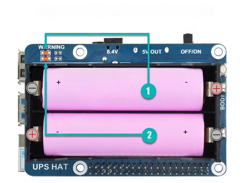 Модуль UPS HAT Waveshare обладает светоиндикаторной системой защиты батареи от обратной полярности. Батарея резервного питания состоит из двух отдельных элементов 18650 с напряжением 3.7 вольта (4.2 вольта при полной зарядке). Для каждого энергоэлемента предусмотрен свой индикатор предупреждения, зажигающийся красным светом в том случае, если аккумулятор 18650 неправильно расположен в отсеке держателя. Подключение напряжения для заряда батареи при любом светящемся индикаторе повлечёт повреждение цепей защиты.