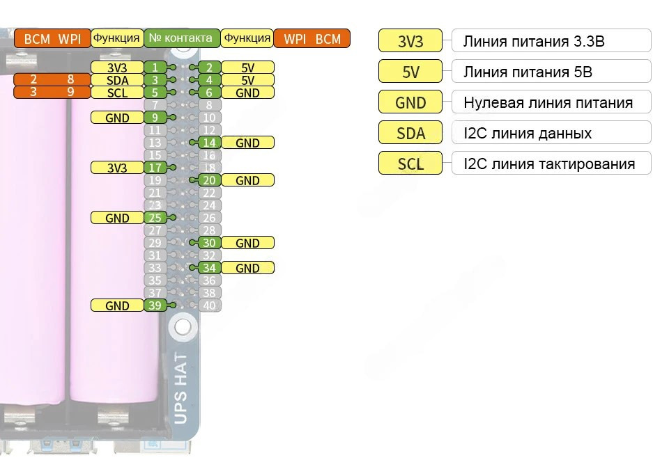 Интерфейсы разъёма GPIO модуля UPS HAT Waveshare