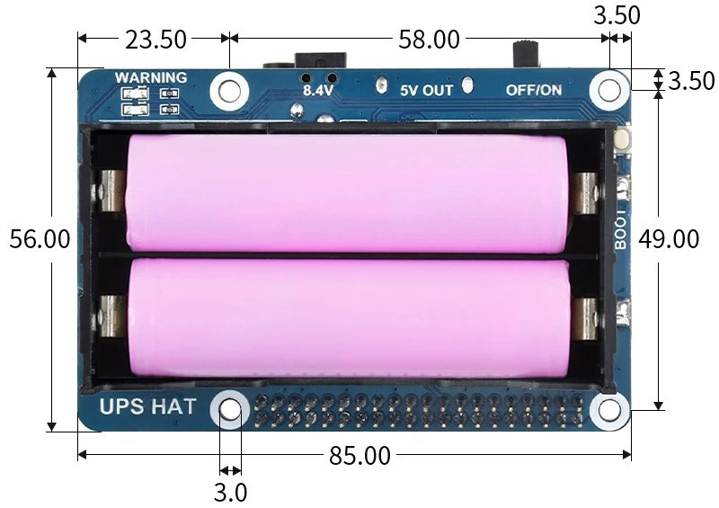 Модуль ИБП с аккумуляторной батареей 18650 выполнен в размерах, эквивалентных плате мини-ПК Raspberry Pi. Он крепиться поверх Raspberry Pi подобно расширению HAT. Бесперебойник фиксируется с одной стороны соединением ответных частей разъёма GPIO, с другой стороны - шестигранными стойками и болтами/гайками. Восполнение энергии резервной батареи осуществляется от входящего в комплектацию зарядного устройства 8.4В 2А постоянного тока DC, подключенного через разъём DC4017 (гнездо-штекер с размерами 4.0мм/1.7мм). Максимальный ток разряда аккумулятора, с учётом потребления платой Raspberry Pi, не должен превышать 2500мА. На плате UPS HAT установлен ползунковый переключатель OFF/ON для ручного управления рабочими напряжениями.