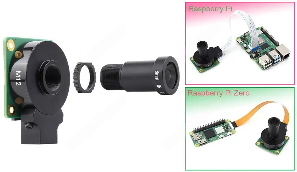 Объектив WS0698012 легко устанавливается в байонет М12 камеры Raspberry Pi High Quality Camera M12. Фиксация положения фокуса объектива осуществляется специальной резьбовой контргайкой (приобретается отдельно, либо используется из набора с оригинальной камерой Raspberry Pi High Quality Camera M12).