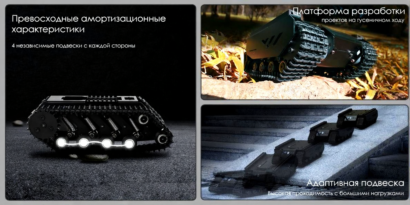 Гусеничное шасси с цельнометаллическим корпусом UGV01 от Waveshare позволяет создавать малогабаритных мобильных роботов с компьютерным разумом под управлением цифровой программируемой платформы Raspberry Pi/Zero, NVidia Jetson Nano/Orin Nano, Horizon Sunrise X3 PI и др. Корпус выполнен из 2-мм листового алюминиевого сплава марки 5052, надёжно защищает внутренне содержание в процессе использования. Конструкция шасси UGV01 отличается повышенной проходимостью по бездорожью и прекрасными амортизирующими характеристиками. Два мощных мотора-редуктора DCGM-3865 с высококачественными металлическими шестерёнчатыми механизмами позволяют мобильному роботу уверенно передвигаться с высокой скоростью до 1 метра в секунду и нести на себе полезную нагрузку до 6.2кг. Двухсторонняя независимая пружинная подвеска UVG01 превосходно снижает силу удара о неровности рельефа и обеспечивают хорошую амортизацию при движении.