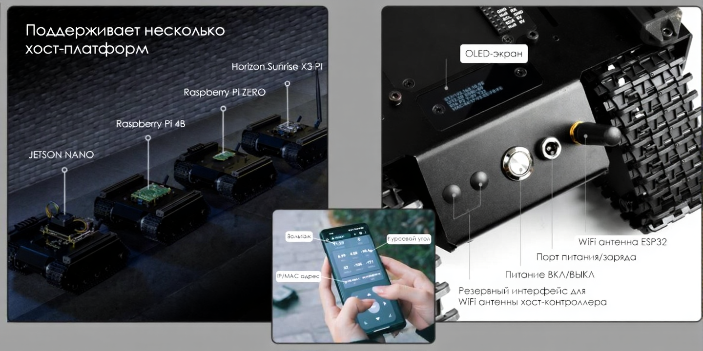 Модель шасси UGV01 комплектуется многофункциональным управляющим драйвером на чипе ESP32. Связь между платой драйвера и хост-контроллером выстраивается на интегрированных в ESP32 интерфейсах беспроводной связи WiFi с настраиваемыми режимами точка доступа/клиент и Bluetooth. Кроме того, представлена опция проводной последовательной коммуникации. Периферия драйвера UGV01 включает в себя 0,91" OLED-экран для вывода информации, 9-осевой инерционный измерительный блок (IMU) для точной трёхмерной ориентации в пространстве, слот карты памяти, датчик температуры и другие функции. Плата драйвера поддерживает управление серво-моторами с последовательной шиной от панорамной камеры, имеет шину USB-UART для подключения лидара — сканера окружения, может генерировать выходной ШИМ-сигнал (камера и лидар не входят в комплектацию). Ручное управление шасси UGV01 с функцией вывода данных блока IMU реализовано отображением страницы графического интерфейса через WEB-браузер на любом мобильном устройстве: смартфоне, планшете и т.д. Все библиотеки с исходным кодом для шасси UGV01 полностью открыты для дальнейшей разработки и доступны к загрузке.