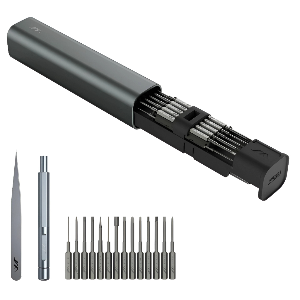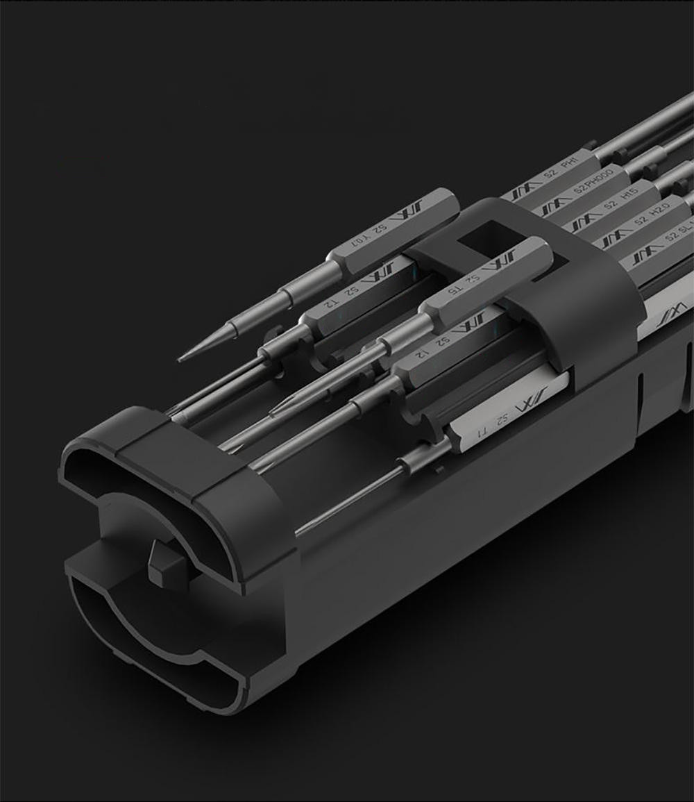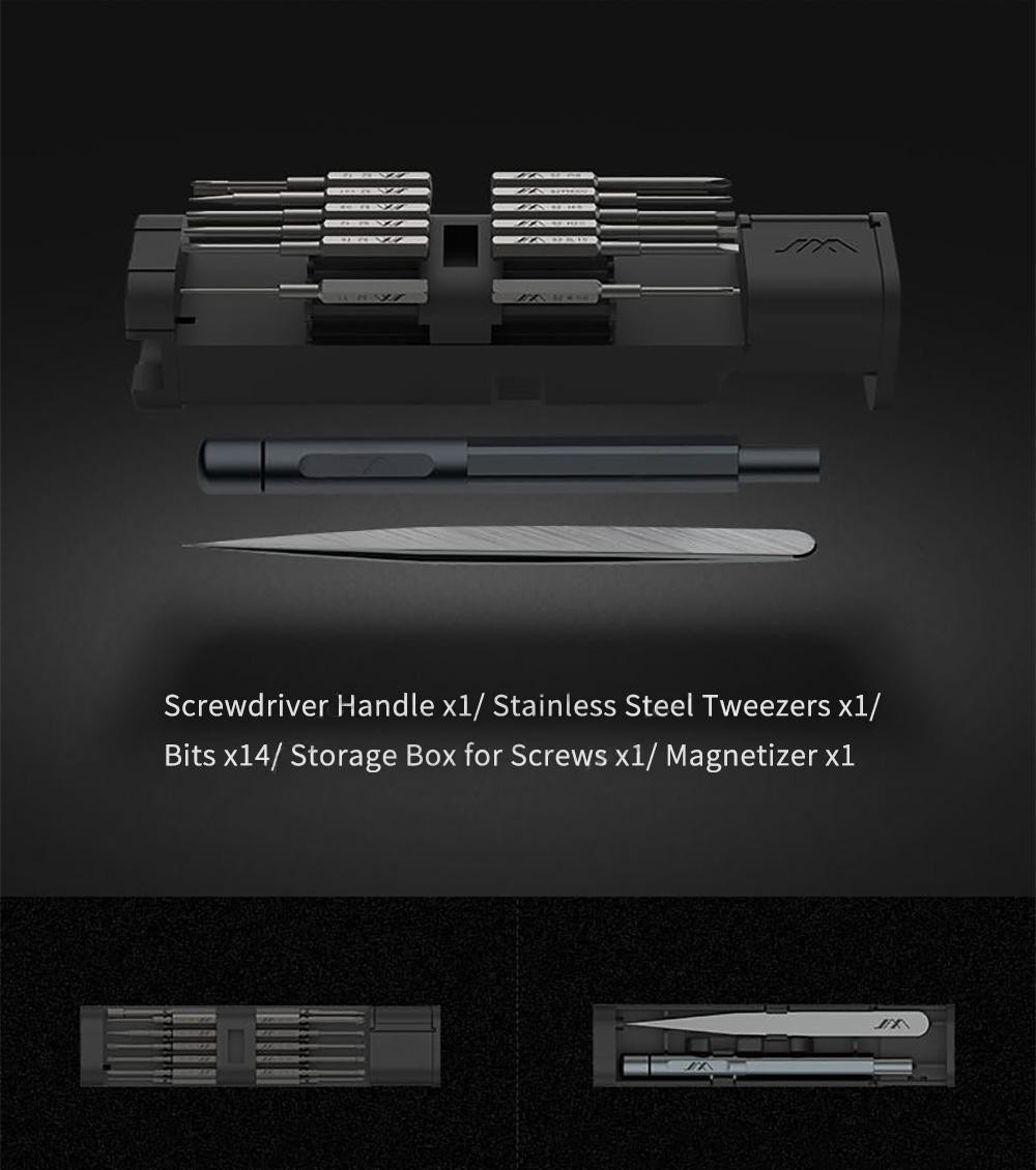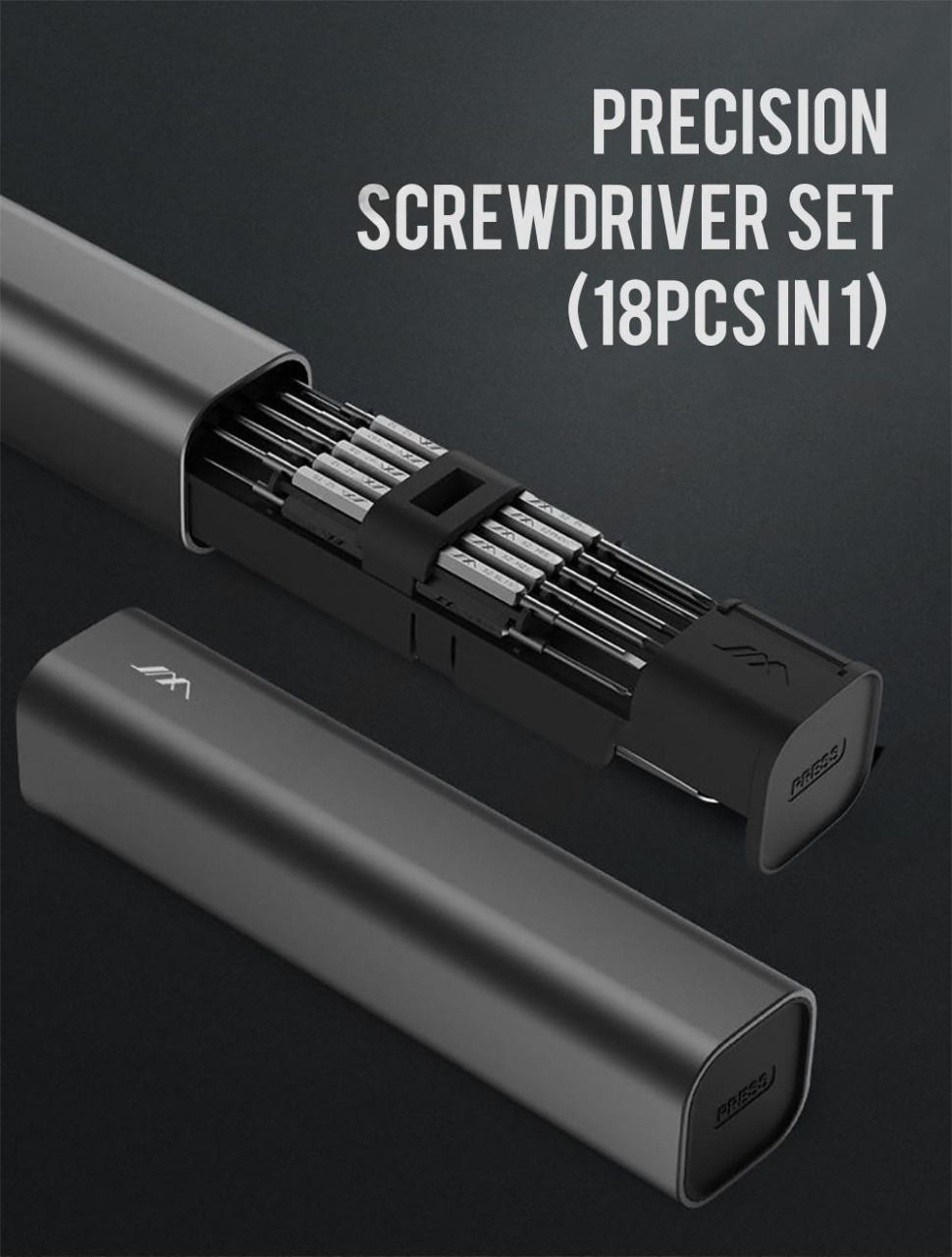 Миниатюрный набор прецизионных отверток JIMIHOME включает в себя 18 предметов для ремонта мобильных телефонов, компьютеров, ноутбуков, планшетов, камер, различных миханизмов, таких как часы и других технических устройств. В набор входит тонкая шестигранная рукоятка изготовленная из анодированного алюминиевого сплава, что делает её стойкой к коррозии и избавляет от скольжения в руке, прецизионный заостренный пинцет для фиксации мелких аксессуаров, магнитный быстросъемный патрон для бит, биты 45,0 мм х 4 мм изготовленные из прочной, и высокопроизводительной стали S2 твёрдостью 50HRC, прецизионные наконечники, обработанные на станке с ЧПУ, а также лазерная маркировка размера на каждой бите для быстрой идентификации. Основной оболочкой служит футляр в форме квадратной трубки, изготовленный из анодированного алюминия, подвергнутого дробеструйной обработке, футляр является антикоррозийным и может быть быстро открыт и закрыт одним нажатием, кроме того, он покрыт анодами, поэтому он не выскользнет даже из потной руки.
