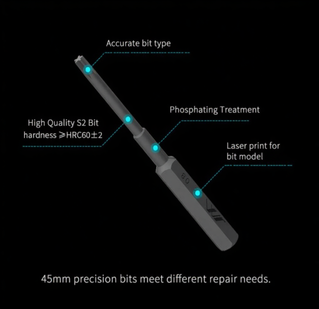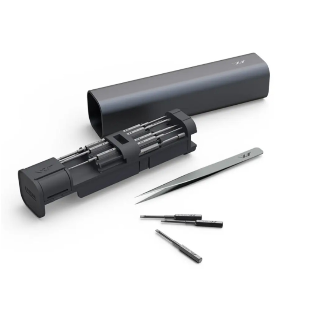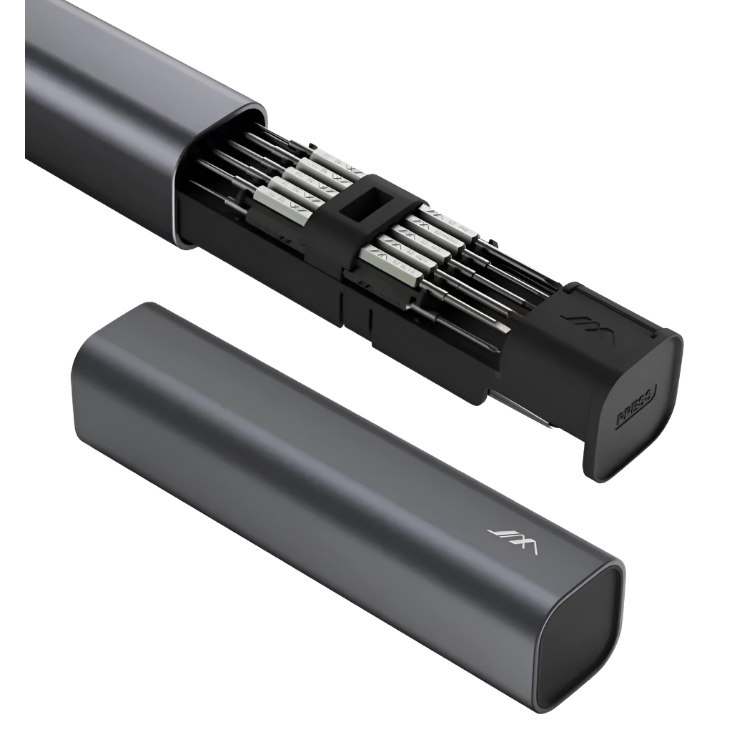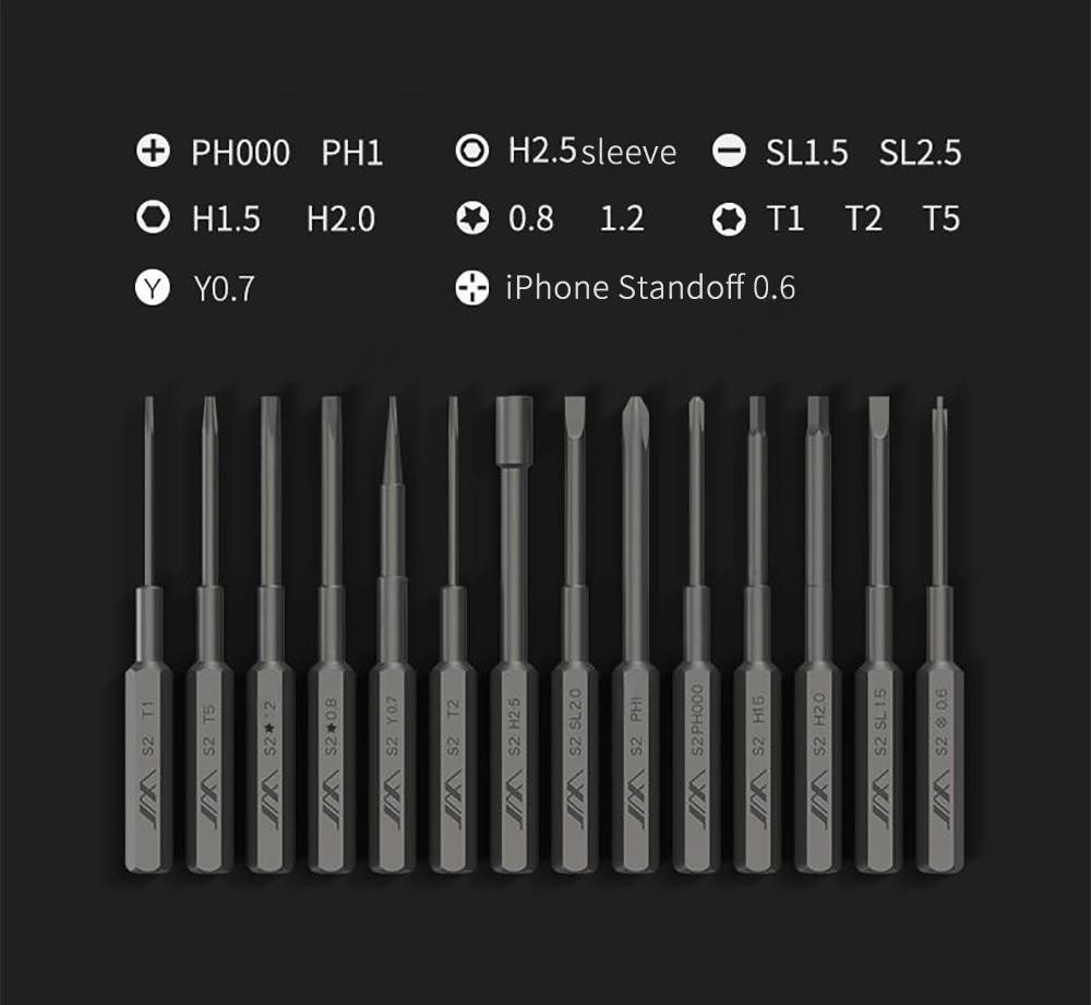 Миниатюрный набор прецизионных отверток JIMIHOME включает в себя 18 предметов для ремонта мобильных телефонов, компьютеров, ноутбуков, планшетов, камер, различных миханизмов, таких как часы и других технических устройств. В набор входит тонкая шестигранная рукоятка изготовленная из анодированного алюминиевого сплава, что делает её стойкой к коррозии и избавляет от скольжения в руке, прецизионный заостренный пинцет для фиксации мелких аксессуаров, магнитный быстросъемный патрон для бит, биты 45,0 мм х 4 мм изготовленные из прочной, и высокопроизводительной стали S2 твёрдостью 50HRC, прецизионные наконечники, обработанные на станке с ЧПУ, а также лазерная маркировка размера на каждой бите для быстрой идентификации. Основной оболочкой служит футляр в форме квадратной трубки, изготовленный из анодированного алюминия, подвергнутого дробеструйной обработке, футляр является антикоррозийным и может быть быстро открыт и закрыт одним нажатием, кроме того, он покрыт анодами, поэтому он не выскользнет даже из потной руки.