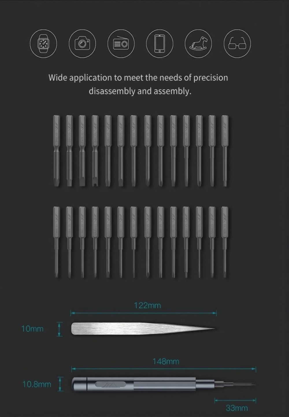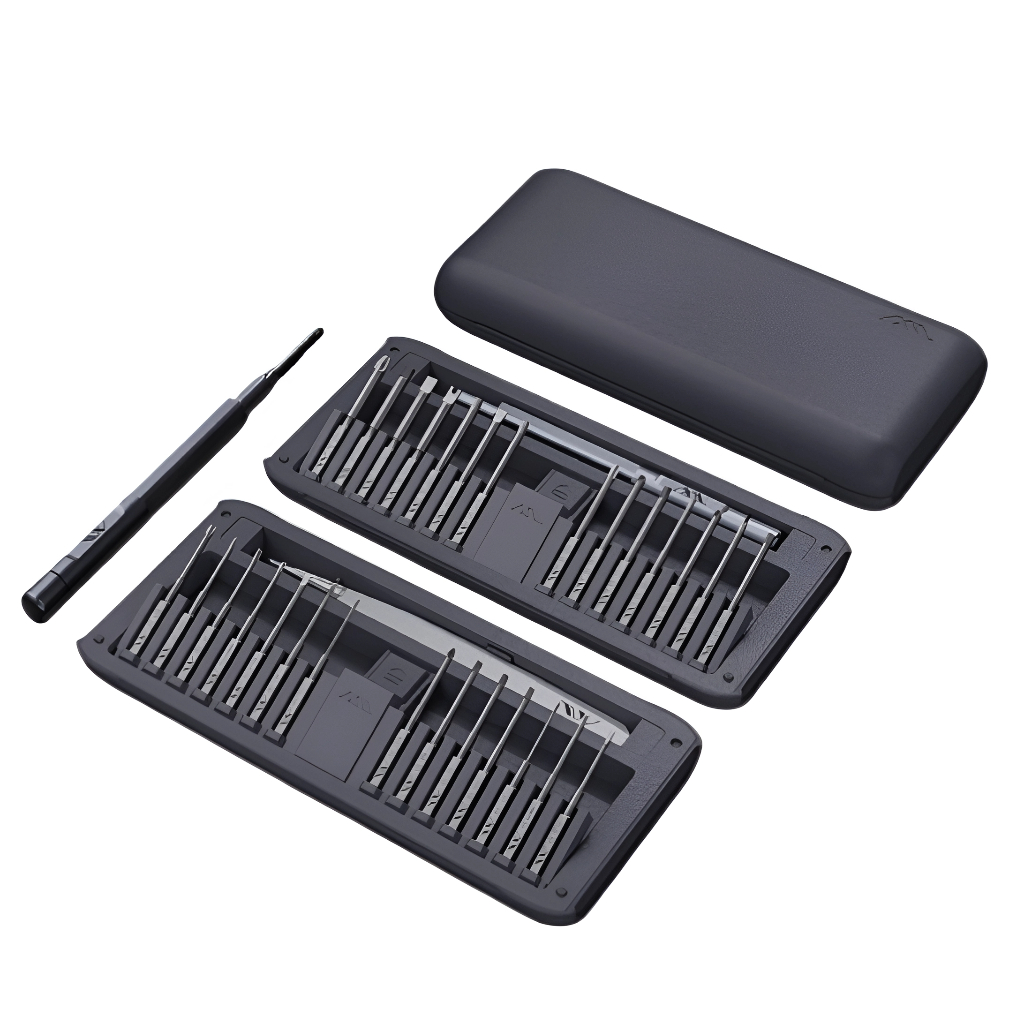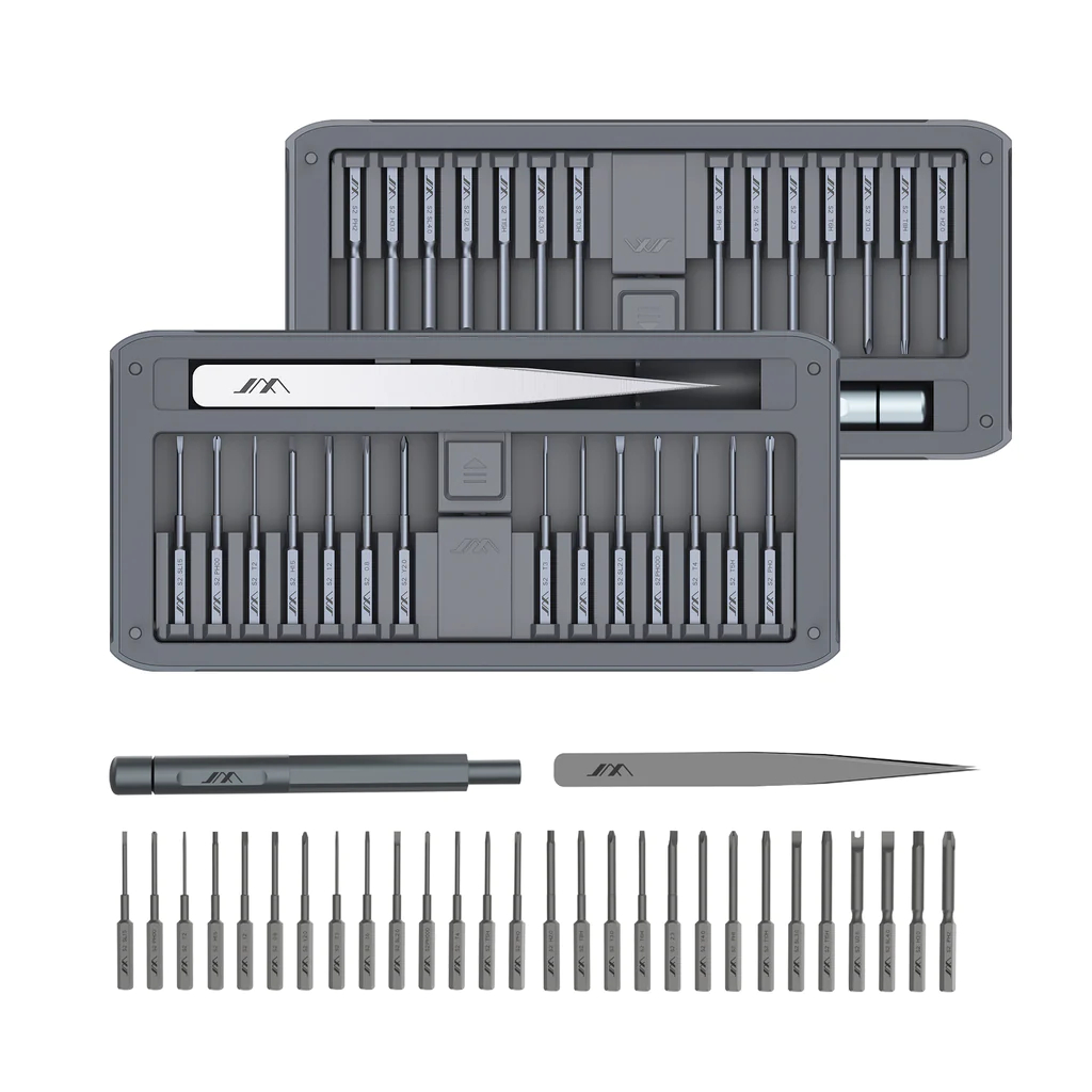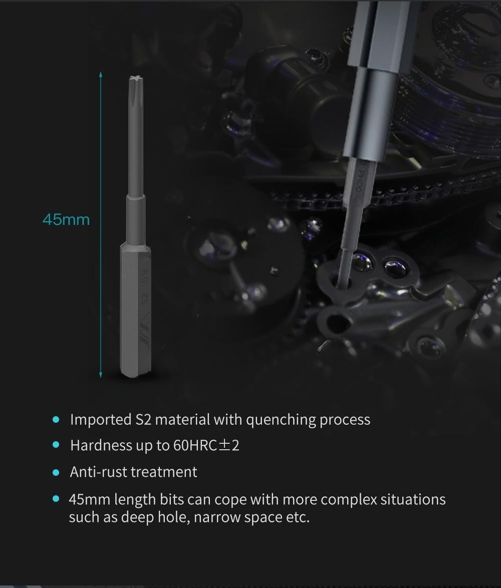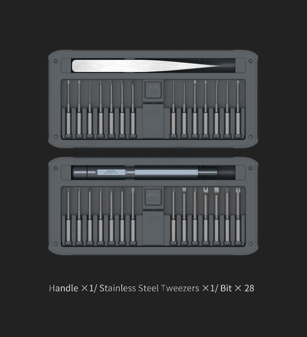 Набор прецизионных отверток JIMIHOME Snap to Go, состоящий из 30 штук с пинцетом, включает 28 штук прецизионных бит диаметром 4 мм, что обеспечивает наличие базового ассортимента бит для ремонта электроники. Набор прецизионных долот из материала S2 включает в себя 10 типов наконечников. Данная отвертка подходит для ремонта и демонтажа устройств, таких как: iPad, компьютер, ноутбук, планшетный компьютер, смартфоны, часы, очки, фотоаппарат и т.д.