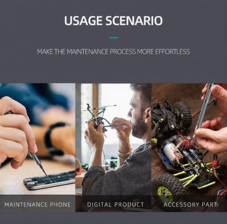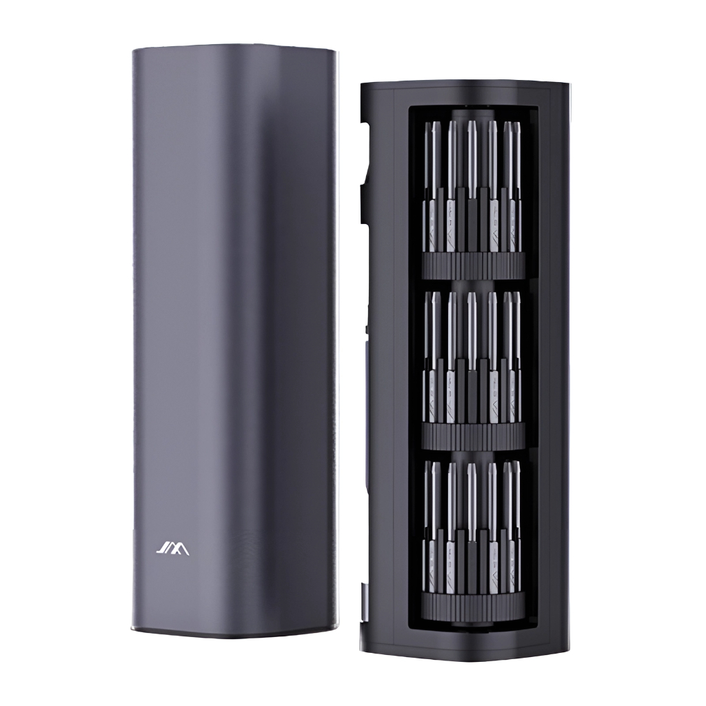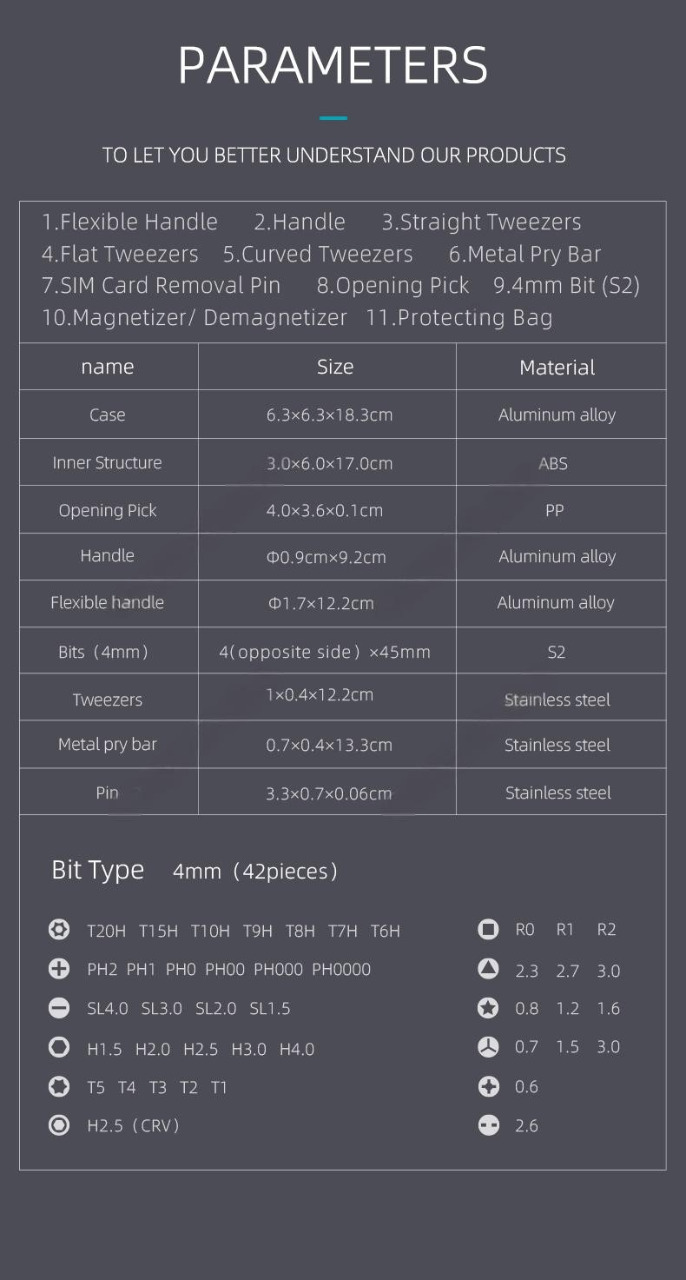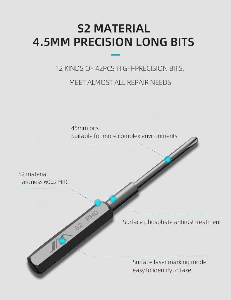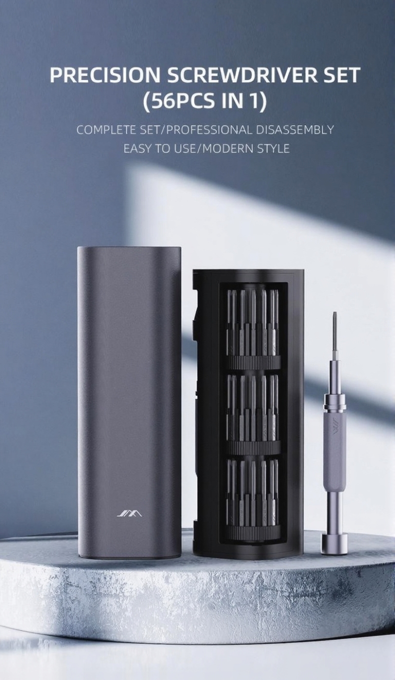 В набор JM-GNT56 от JIMIHOME входят 42 прецизионные отвертки разных размеров, которые изготовлены из прочного стального сплава S2, каждый наконечник помечен лазерной маркировкой, что упрощает поиск. В комплекте вы найдете специальную ручку, её изготовили из алюминиевого сплава, она обладает высокой прочностью и является достаточно лёгкой, ещё одним плюсом является встроеный магнит, который легко позволяет устанавливать биты. Также в набор входят 3 типа пинцетов из нержавеющей стали, 2 ручки, ключ для извлечения SIM-карты, металлический инструмент для подмонтажа, намагничиватель и размагничиватель. Все элементы помещены в практичный кейс, который поворачивается на 360°, сам кейс изготовлен из прочного и стойкого к коррозии материала. Данный набор отверток идеально подойдет при ремонте телефона, планшета, компьютера, монитора, фотоаппаратов и мелкой бытовой техники.