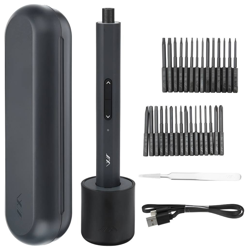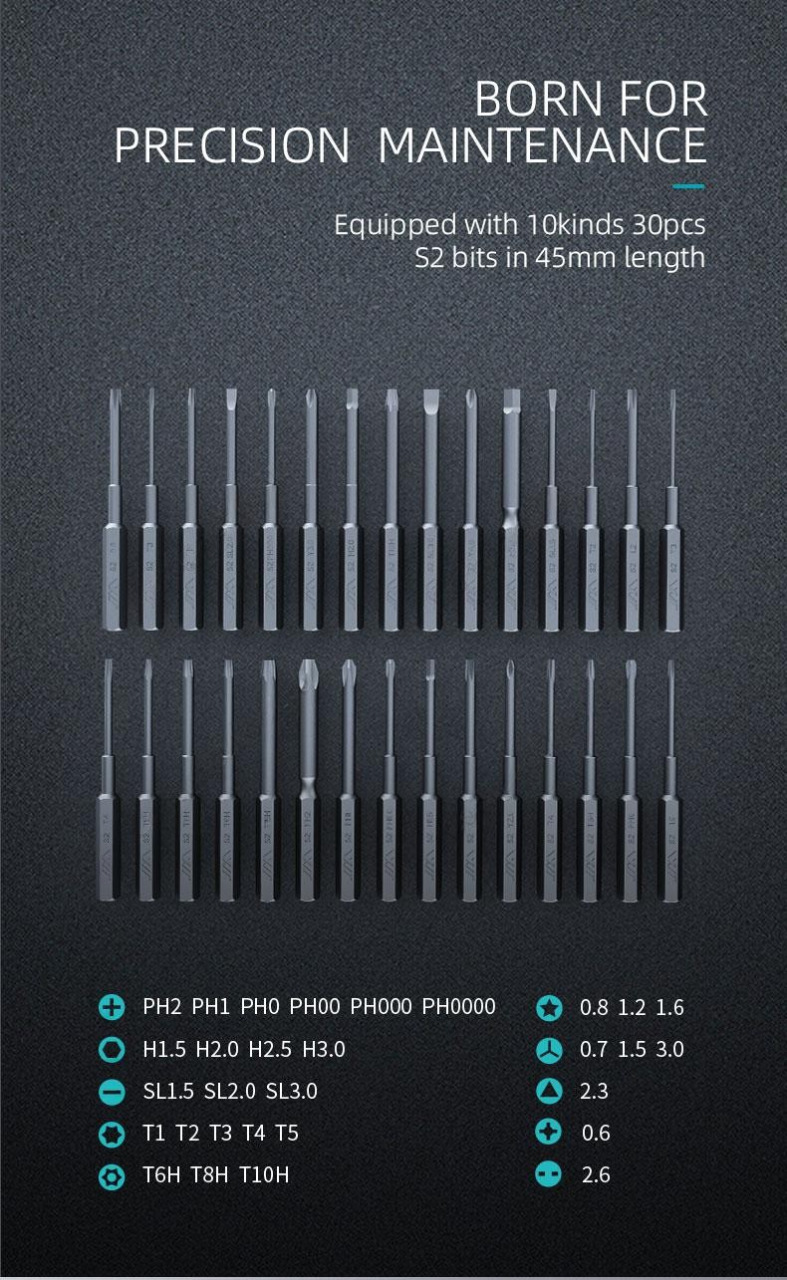Набор прецизионных отверток JIMIHOME состоит из 30 штук прецизионных бит S2 диаметром 4 мм, необходимых для ремонта электроники. Рукоятка из ABS-пластика предотвращает скольжение. Магнитный быстросъемный патрон-насадка облегчает быструю замену бит. Встроенная светодиодная подсветка на 360° освещает рабочую зону. Каждая бита имеет удобную маркировку лазером, позволяющую быстро определить его размер. Кроме того, магнитные наконечники бит могут захватывать крошечные винты в случае случайного падения или потери, предотвращая повреждение. Набор отверток хранится в прочном футляре из ABS-пластика с магнитной защитой, каждая деталь имеет плотно прилегающее гнездо для хранения, что обеспечивает удобство и доступность в переноске.