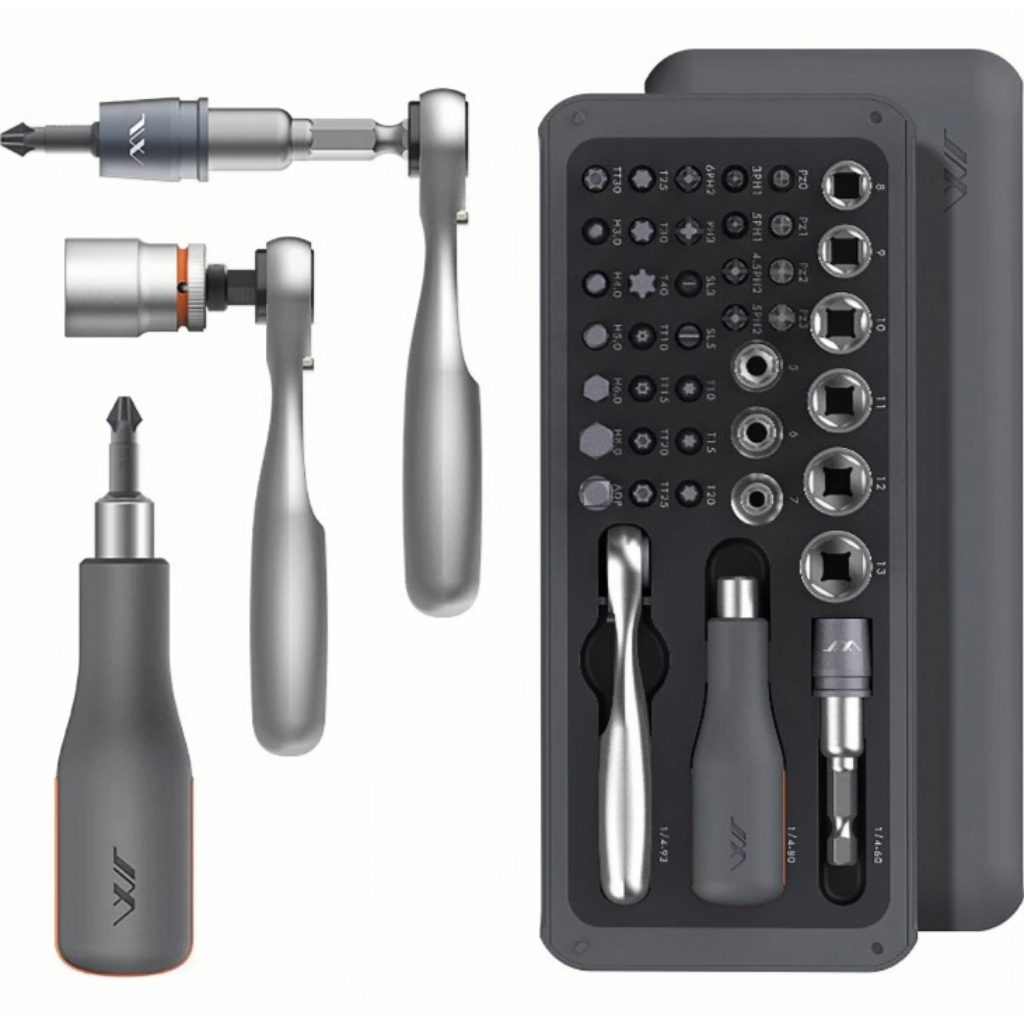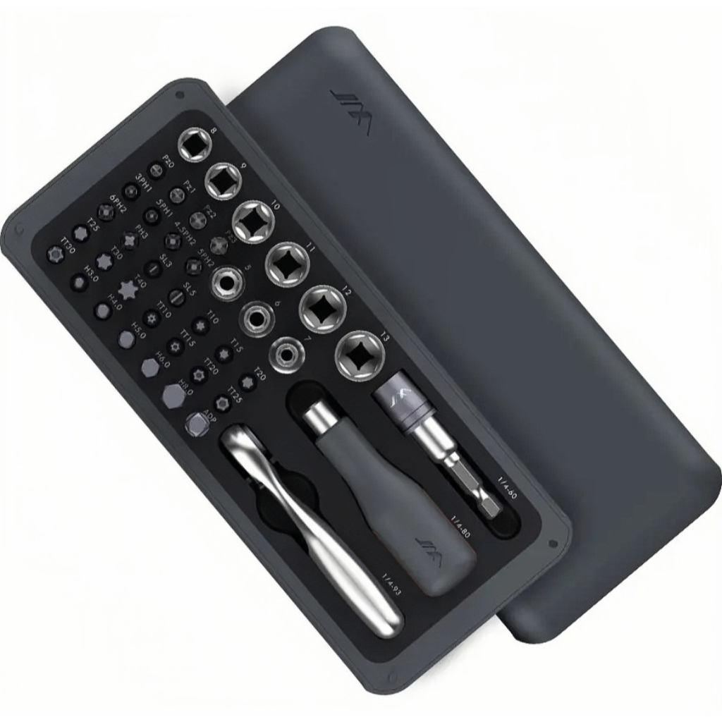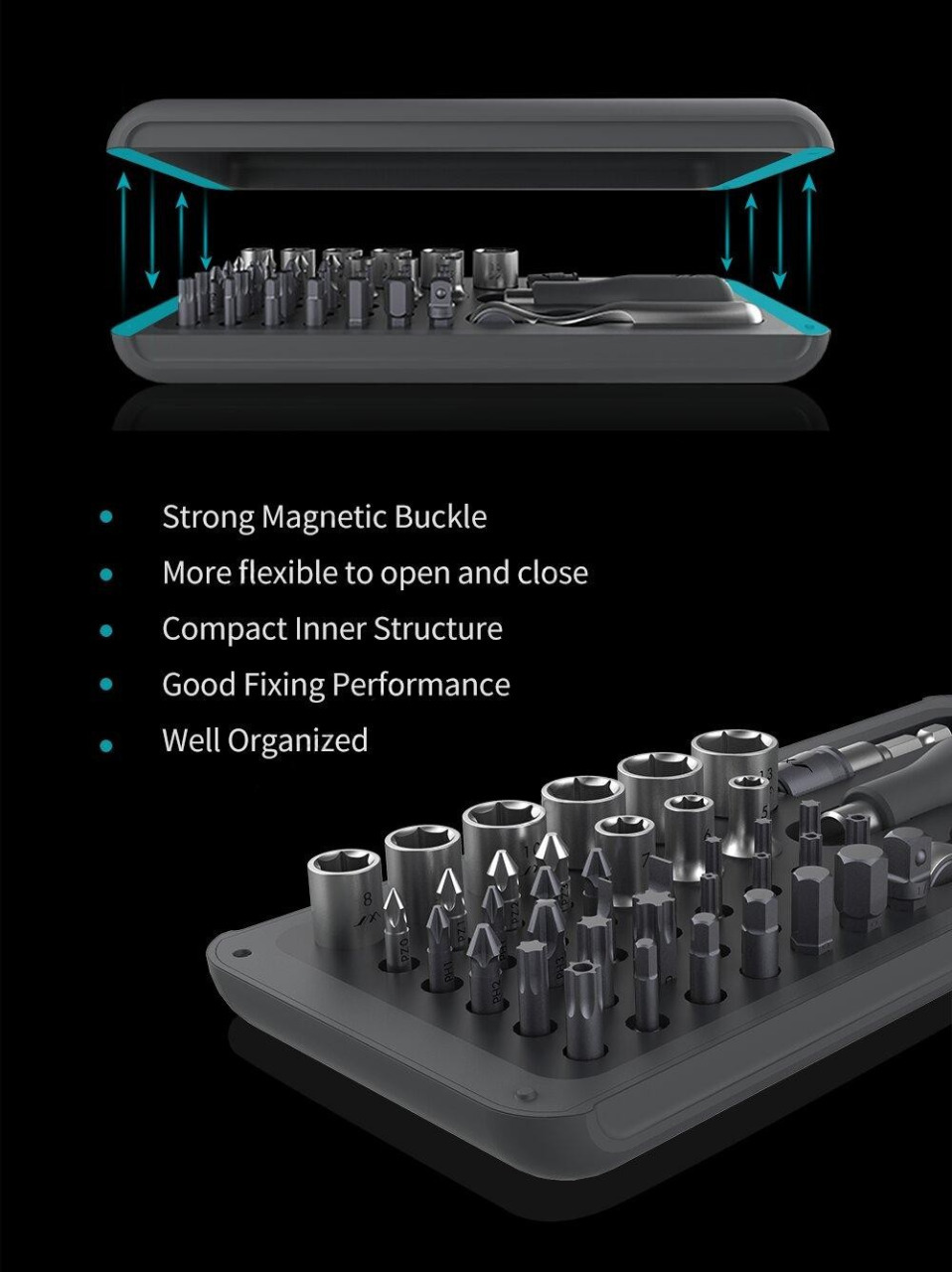 В универсальный набор отверток JIMIHOME JM-GNT41 входят: 28 функциональных насадок, 9 шестигранных головок, ключ с трещоткой, переходник, удлинитель-адаптер с магнитным держателем и ручка из алюминиевого сплава подходящая для всех частей. Данный набор подойдёт для ремонта мотоцикла, компьютера, смартфона, планшета, разборки мелких деталей, сервисного ремонта, замены велосипедных колёс и многого другого. Каждый компонент набора изготовлен из высококачественных материалов, обеспечивающих долговечность и практичность инструмента. Ключ с храповым механизмом изготовлен из сплава цинка и хромо-ванадиевой стали, а насадки и переходник из специального сплава стали S2. Все элементы помещены в практичный кейс изготовленого из прочного ABS-пластика.