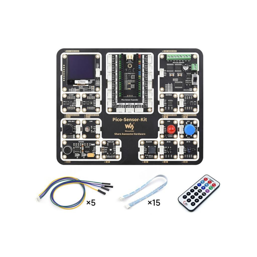 Комплект датчиков совмещен на одной плате с 1,5 дюймовым OLED-экраном и драйвером двигателей для управления всем этим набором с помощью микрокомпьютера Raspberry Pico.