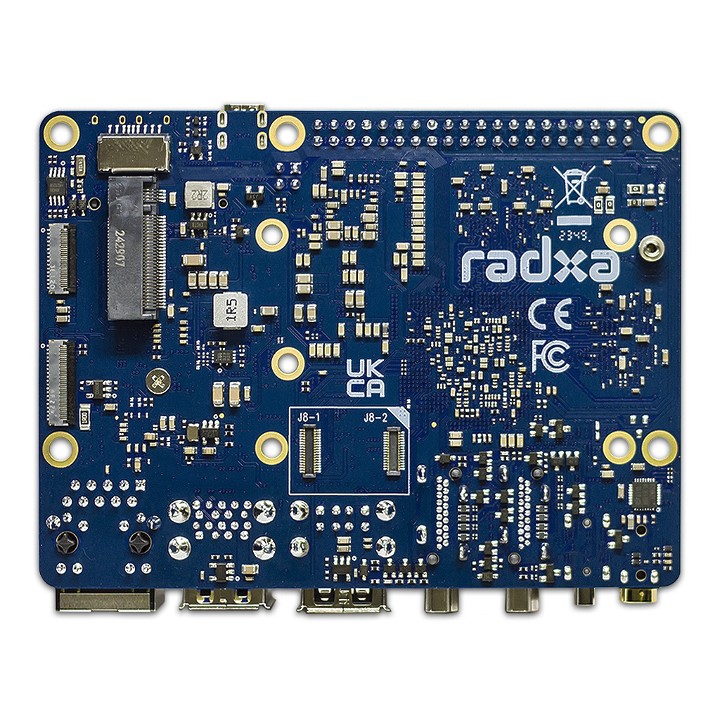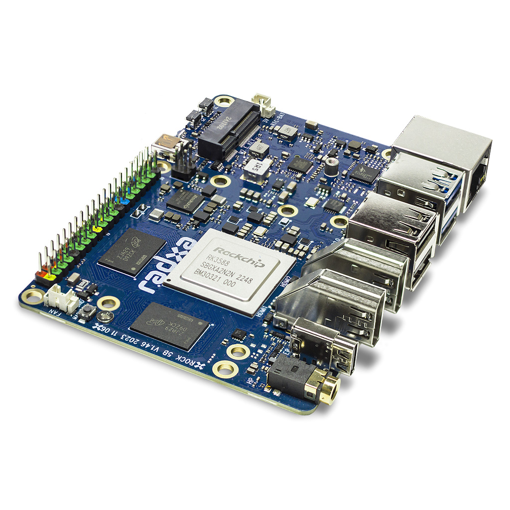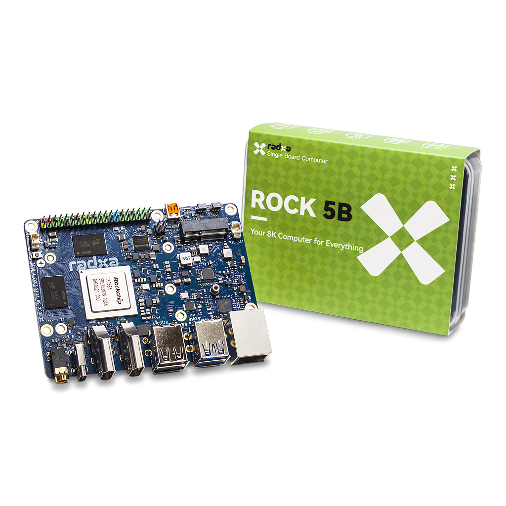 Модель 5-го поколения Radxa ROCK 5B — это один из немногих одноплатных компьютеров с поддержкой разрешения 8K и одновременным подключением до 4-х дисплеев. Модуль Radxa ROCK 5B построен на передовом процессоре Rockchip RK3588 со всеми его достоинствами в форм-факторе Pico-ITX. Архитектура процессора RK3588 Big.Little состоит из 4 ядер ARM Cortex-A76, работающих на частоте до 2.4ГГц и 4 ядер ARM Cortex-A55, работающих на частоте до 1.8ГГц. Внутри чипа RK3588 располагается видео ARM Mali-G610 MС4 со встроенным 3Д-ускорителем (GPU), поддерживающим OpenGL / OpenCL / Vulkan и нейронный процессор (NPU), использующийся для приложений ускорения машинного обучения. Быстродействие нейронного процессора достигает отметки 6 TOPS в смешанных операциях INT4/INT8/INT16/FP16. В связке с процессором установлена память ОЗУ LPDDR4 размером до 32ГБ. Для записи ОС и хранения данных программ используется слот TF/U-карт microSD или внешний модуль eMMC с выбором размеров 16ГБ, 32ГБ, 64ГБ, или 128ГБ. А также имеется порт M.2 M-Key с шиной PCIe 3.0x4 для подключения любых NVME SSD дисков форм-фактора 2280.