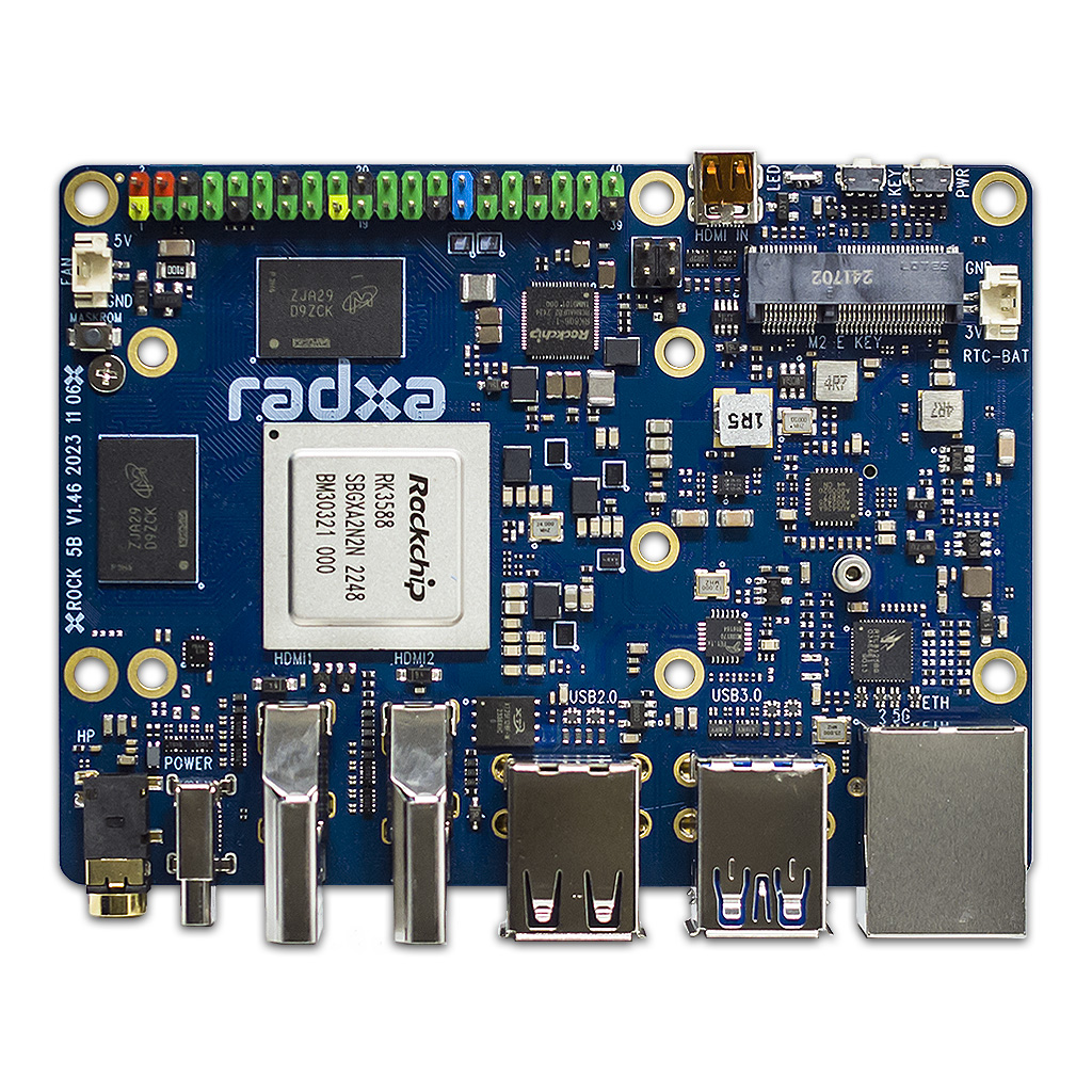 По периметру платы ROCK 5B+ расставлены порт 2.5-гигабитного Ethernet, 40-контактный разъём входов-выходов общего назначения (GPIO), хост-порты USB2.0/USB3.0 формата USB-A, вертикальный порт USB-C для питания ROCK 5B+, два порта HDMI-A v2.1 с выходом в разрешении до 8К@60Гц и один входной порт microHDMI 4К@60Гц. В состав одноплатника включены: разъём для камеры MIPI CSI, горизонтальный порт Type-C USB3.0/OTG с выводом изображения на дисплей до 4K@60Гц (DP1.4), раздельные порты питания домена RTC и вентилятора охлаждения. Предусмотрен аудио разъём 3.5мм AUX для вывода звука на наушники или внешние динамики. Встроенная функция беспроводной связи не представлена, имеется коннектор подключения промышленных модулей Wi-Fi/Bluetooth M.2 2230 с интерфейсом M.2 E-Key. Потребляет ROCK 5B до 25Вт электроэнергии, подходит стандартный источник питания с выходными характеристиками 5В/5А. Совместимые с Radxa ROCK 5B+ операционные системы: Radxa OS, Debian 12, Android 12, FydeOS, Armbian, Windows 10/11 (версия для ARM) и др.
