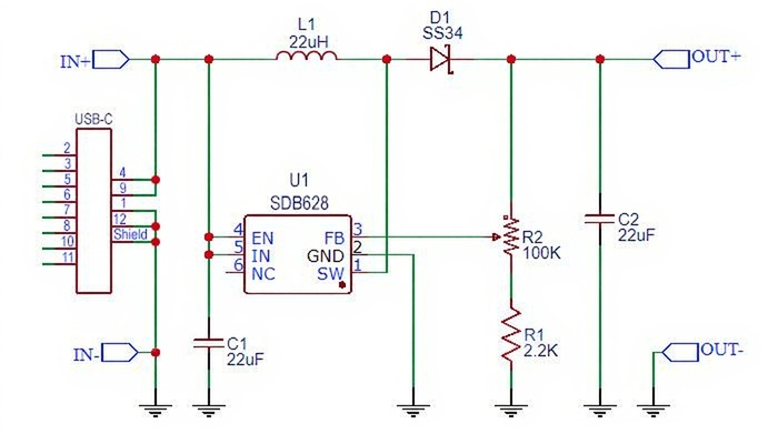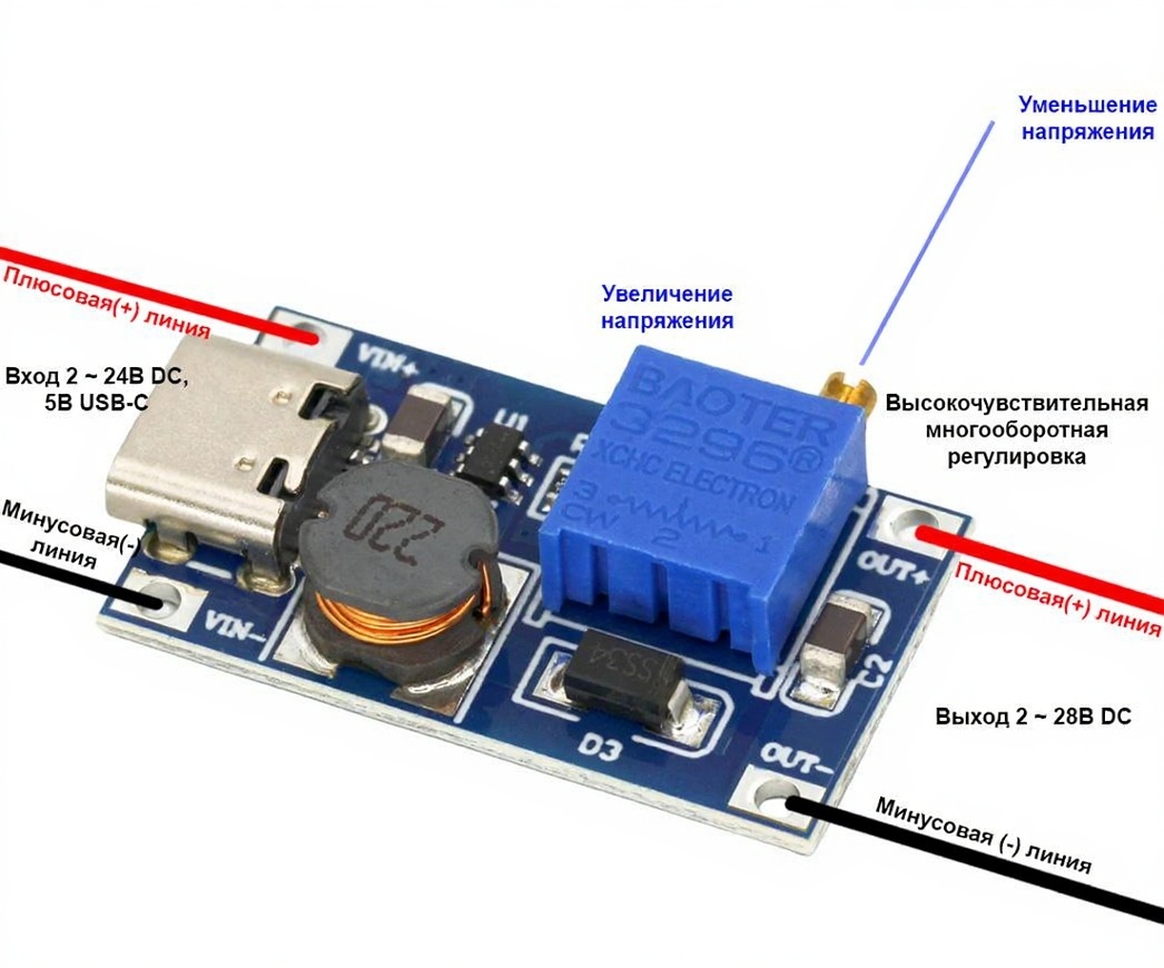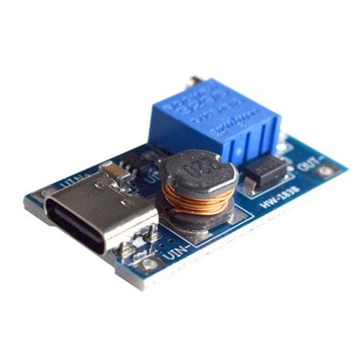 Преобразователь постоянного напряжения DC-DC на SDB628 повышающий с входом Type-C, выбор напряжения - регулятором , Вх. напр. - 2-24 В. Напр. вых - 2-28 В. Ток выхода - до 2А, размеры 36*17*7 мм. Вес 4гр.