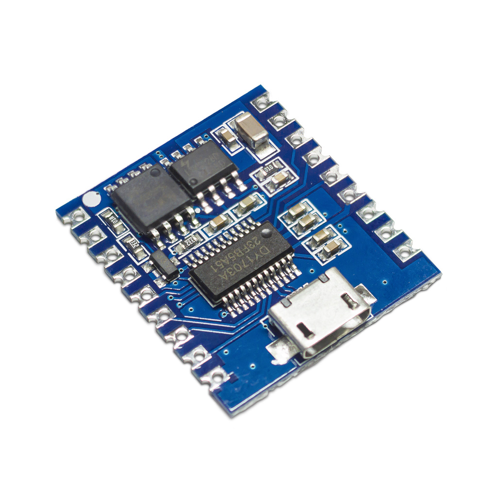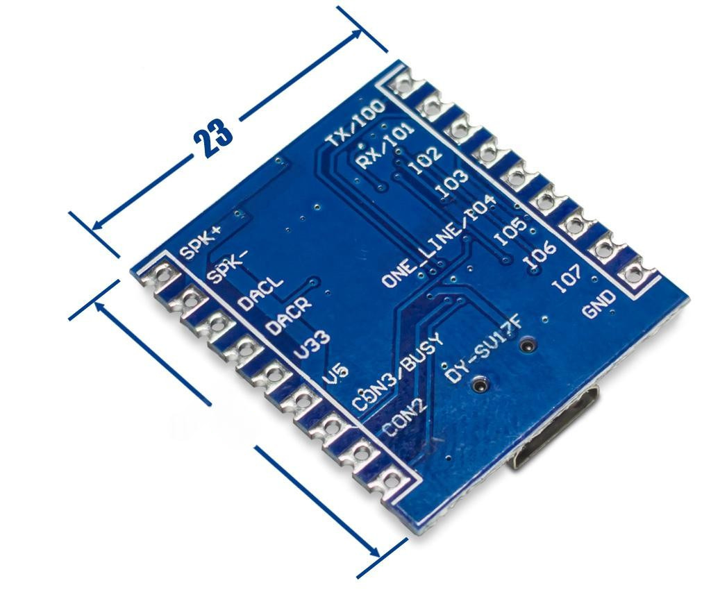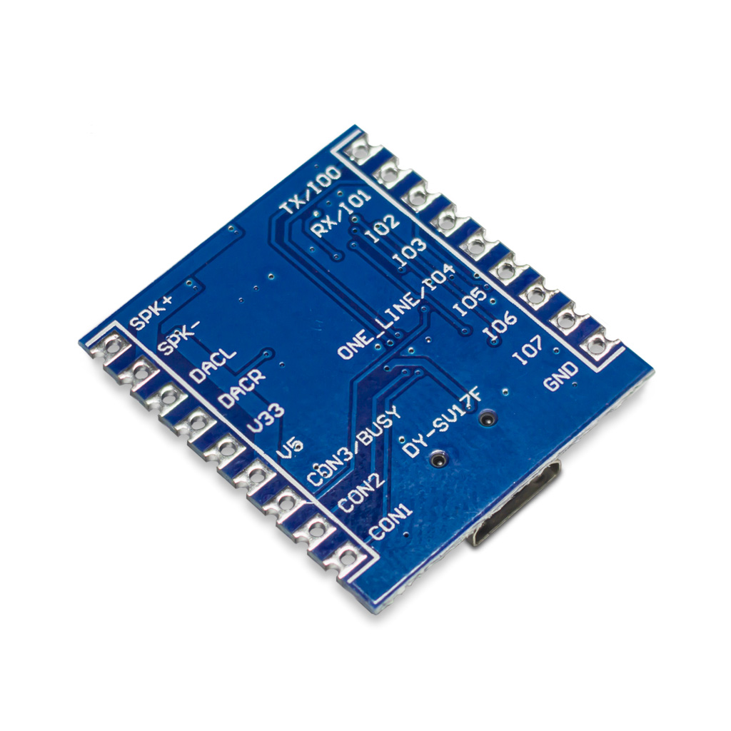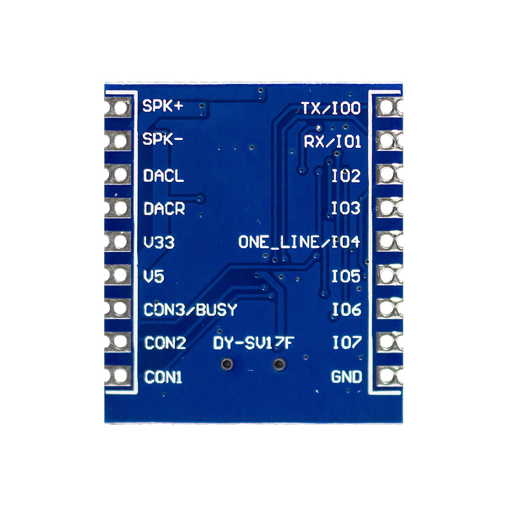Аудиомодуль DY-SV17F оснащается чипом флеш-памяти 4 МБайт и стандартным коммуникационным портом USB2.0 MicroUSB для подключения к стационарному/планшетному ПК или смартфону. Механизмом внутренней индексации аудиозаписей определяются правила нумерации файлов, их размещение и формы обращения к ним. На плате MP3-плеера размещены 24-разрядный ЦАП с независимым выходом и монофонический усилитель D-класса мощностью 5Вт. Схемой устройства предусмотрены 7 программируемых вариантов управления. В 5-ти импульсных режимах задействуются до 8 логических портов ввода-вывода IO0~IO7, соединяемые с внешним контроллером или кнопочной клавиатурой. В 2-х последовательных режимах, для приёма цифровых команд используется шина связи UART или канал проприетарного протокола One-Line. В импульсном режиме, для проигрывания доступно не более 255 файлов. В последовательном режиме - до 65535 файлов. MP3-плеер запитывается от источника стабилизированного 5-вольтового напряжения и потребляет до 60мА в рабочем режиме. DY-SV17F может эксплуатироваться в автономных проектах с литиевой батареей 3.7В, соединённой с модулем через повышающий DC-DC преобразователь напряжения.