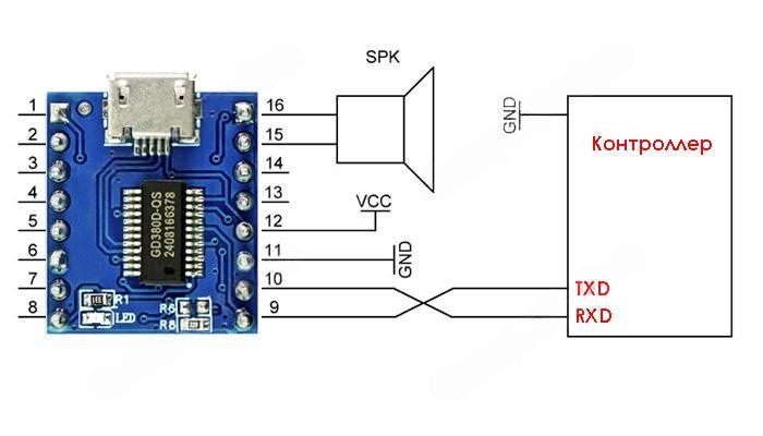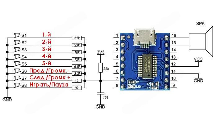 | 1 | K1 | Вход триггера воспроизведения 1-го аудио | 16 | SPK+ | Плюсовой выход на динамик 1.5Вт / 8 Ом |