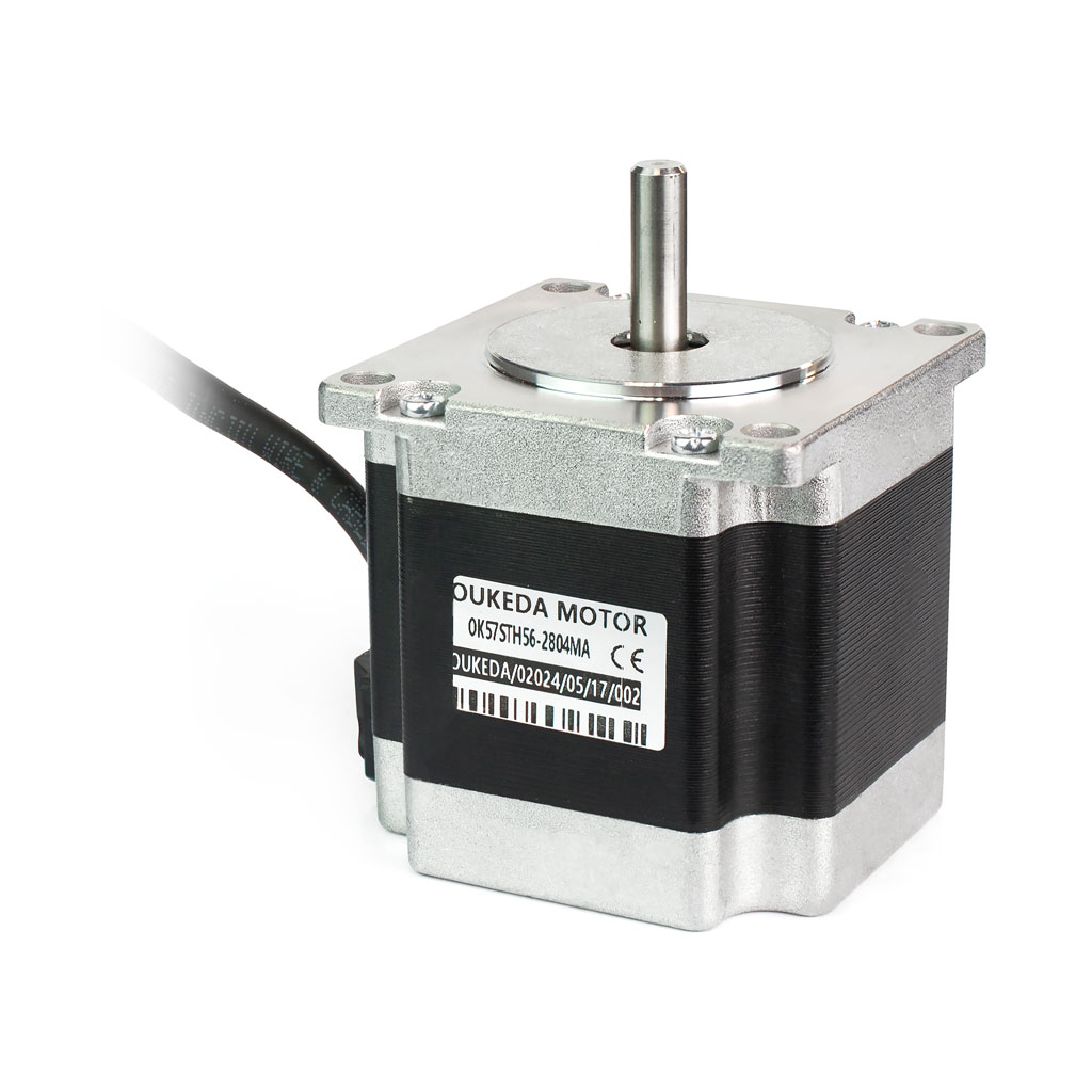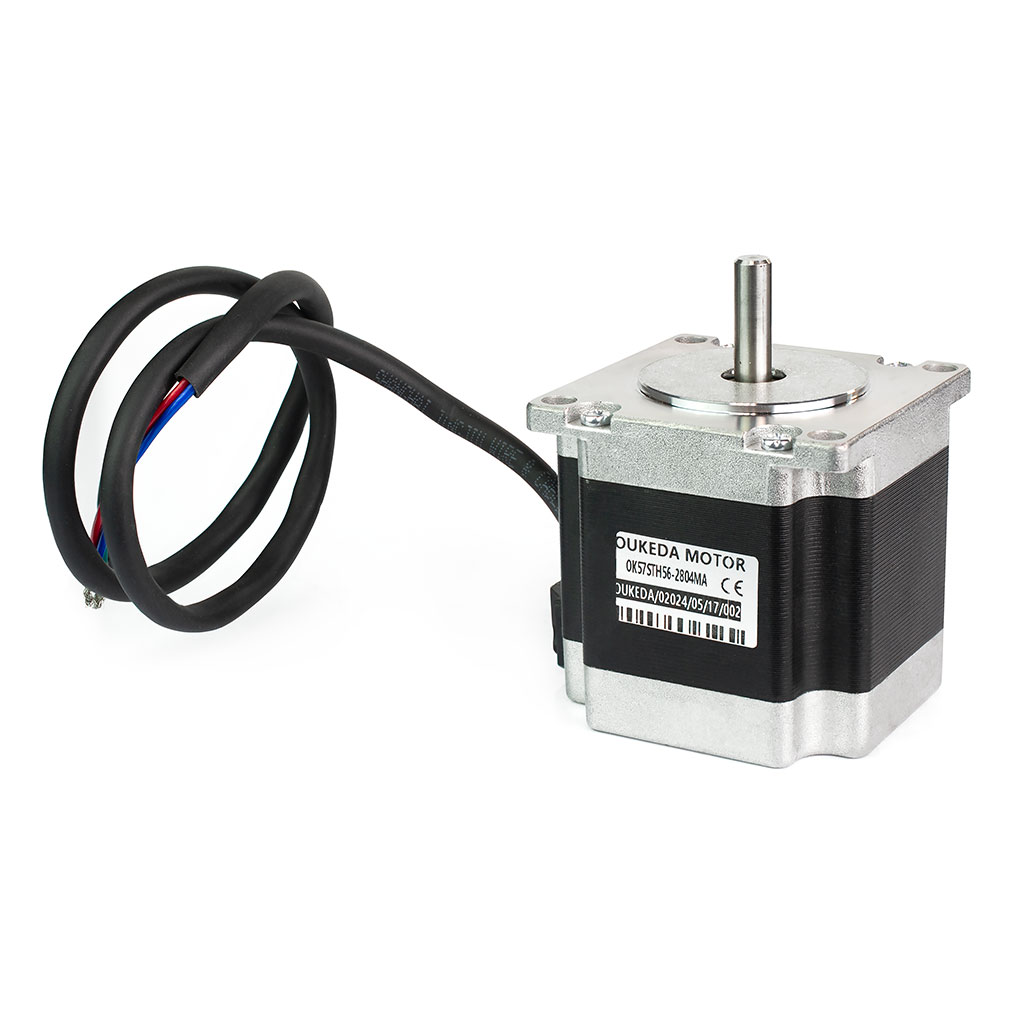 Мотор шаговый NEMA23 модель OK57STH56-2804MA, двухфазный, униполярный, 4х проводной. Ток фазы: 2.8А. Момент удержания: 9.0 кг/см. Шаг: 0.9°. Размеры: 56х56х55мм